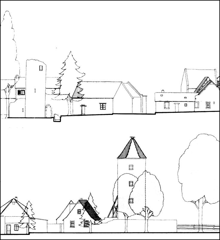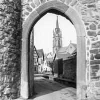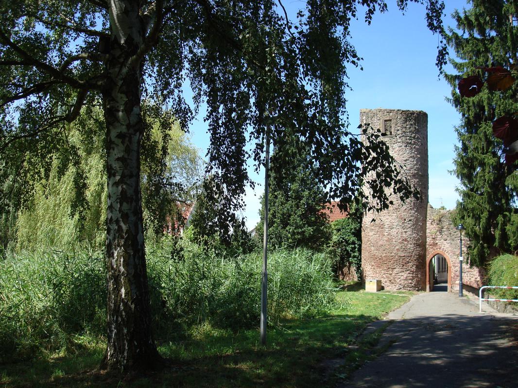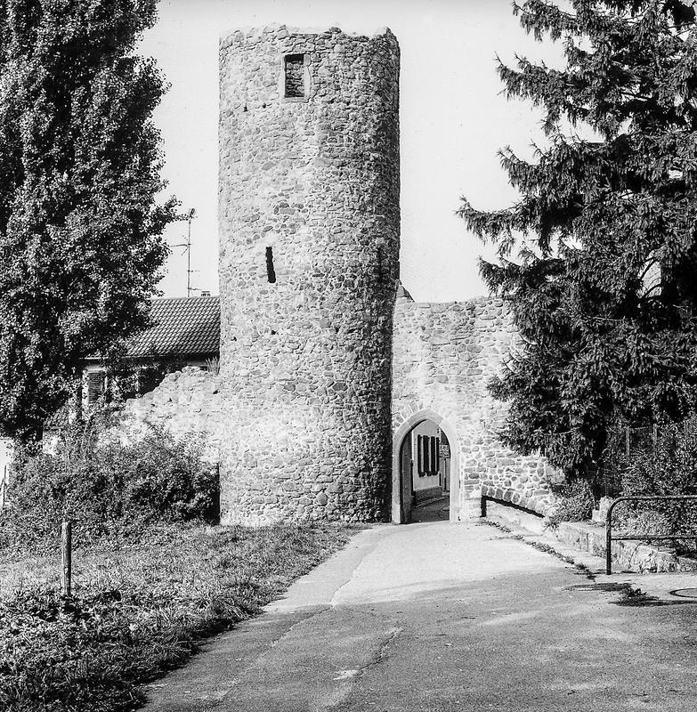 Ruine des Rundturmes und Reste der Wehrmauer mit Pforte, mit der Ortsbefestigung wohl kurz vor 1336 unter Falkensteiner Herrschaft errichtet. Das spitzbogige "Weihertürchen", früher Eingangstür der alten Jakobskirche, wurde 1905 in die Mauer eingesetzt. Daneben die Öffnung für den mit Sandsteinplatten eingefassten Bachlauf. Wichtig der ungestörte Übergang von der Altstadt zur "Heege". Ein weiterer Rest der Wehrmauer auf dem Grundstück Frankfurter Straße 20 erhalten. Kulturdenkmal aus städtebaulichen und ortsgeschichtlichen Gründen.