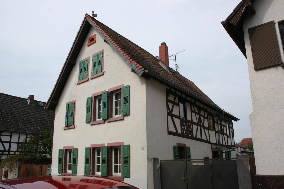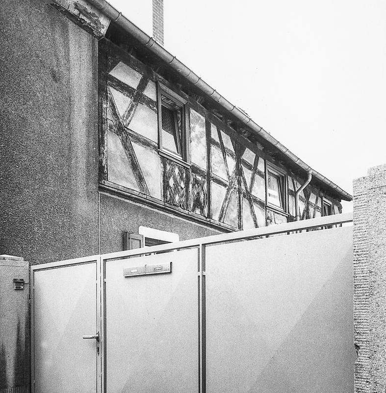 Östliche Obergeschoss-Traufwand als Sachteil eines modern überformten barocken Fachwerkhauses, Fragment mit besonders klarer Ausprägung der ornamentalen Figurationen. Durchkreuzte Raute und regional seltenes Radmotiv als Brüstungszier, vollständige Mannfiguren in regelmäßigem Rhythmus. Um 1700 entstandenes Bauteil von überdurchschnittlicher Qualität und daher aus baukünstlerischen Gründen geschützt.