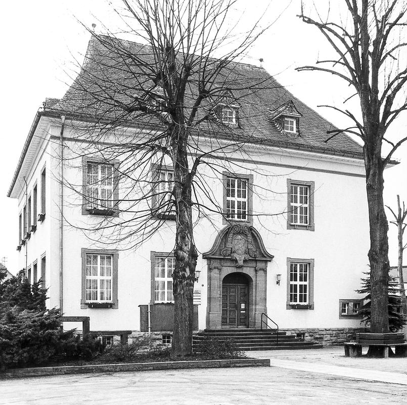 Zweigeschossiger kubischer Putzbau mit hohem Walmdach, 1908 in neubarocken Formen errichtet. Sockel, Fenstergewände und aufwendiges Eingangsportal mit geschwungenem Giebel und Wappen aus Sandstein. Vertreter eines historistischen Bautyps, wie er in einigen Beispielen kurz nach der Jahrhundertwende im Kreis auftritt. Südlich neuer Anbau. Aus künstlerischen und ortsgeschichtlichen Gründen als Kulturdenkmal geschützt.