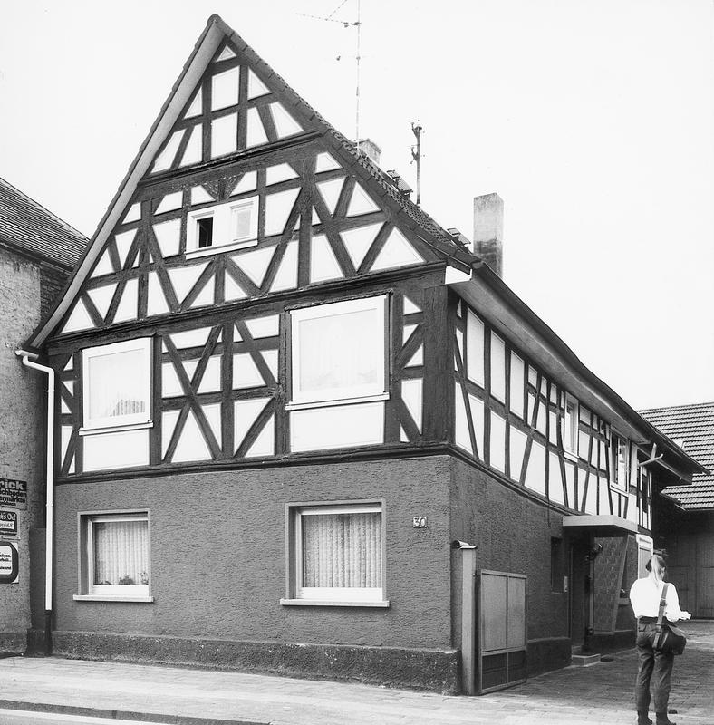 Wohnhaus mit massiv erneuertem Erdgeschoss, im OG kräftiges Fachwerk mit Merkmalen des Rodgauer Typs, wie stehendem Stuhl und Mannfiguren im Giebel; hier auch geschnitzte Knaggen. Giebelfeld heute verschindelt. Außergewöhnlich die Verstrebungsfigur im Obergeschoss als geschosshohes Andreaskreuz zwischen störenden Fenstereinbauten. Trotz der Beeinträchtigung durch neue Fenstereinbauten wichtiger Bestandteil des Straßenbildes. Daher Kulturdenkmal aus städtebaulichen und ortsgeschichtlichen Gründen.