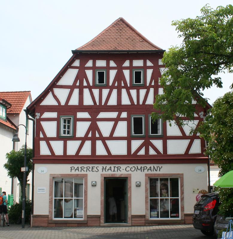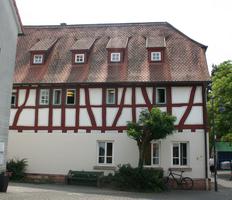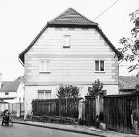 Voluminöses, im Erdgeschoss verputztes Fachwerkhaus, erbaut 1591 mit Krüppelwalm. Das ehemals verkleidete, Mitte der 1990er Jahre freigelegte Fachwerk mit gebogenen Streben und Wilder Mann-Figuren. Das Haus ragt derart in die Kurve der Hintergasse, dass sowohl Giebel- wie Traufseite optisch den Straßenraum abschließen. Die Einfriedung mit drei Sandsteinpfosten nicht erhalten. Kulturdenkmal aus ortsgeschichtlichen und städtebaulichen Gründen.
