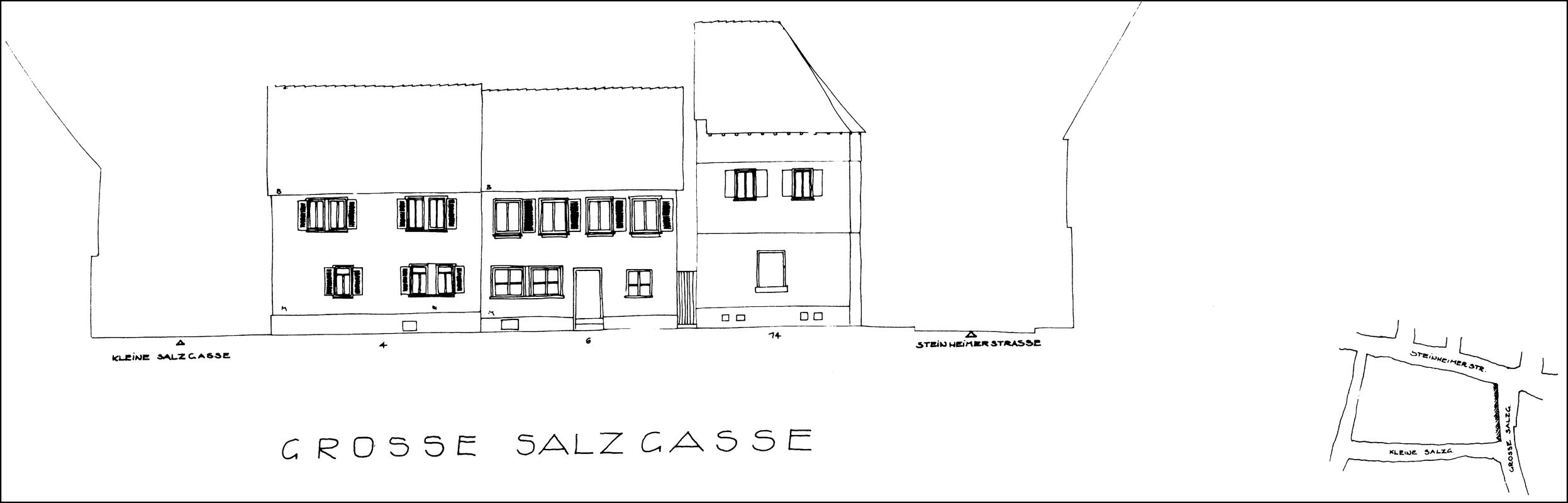 Giebel und überbaute Hofeinfahrt des Gebäudes sind zur Kleinen Salzgasse ausgerichtet. Von der Fensterstellung ausgehend, ist unter dem Verputz das weitgehend erhaltene bauzeitliche konstruktive Fachwerk zu erwarten. Die geschlossene Fachwerktraufwand zwischen Steinheimer Straße und Kleiner Salzgasse verbindet das Gebäude mit dem Nachbarhaus Nr. 6. Erhalten ist auch der bauzeitliche Gewölbekeller.