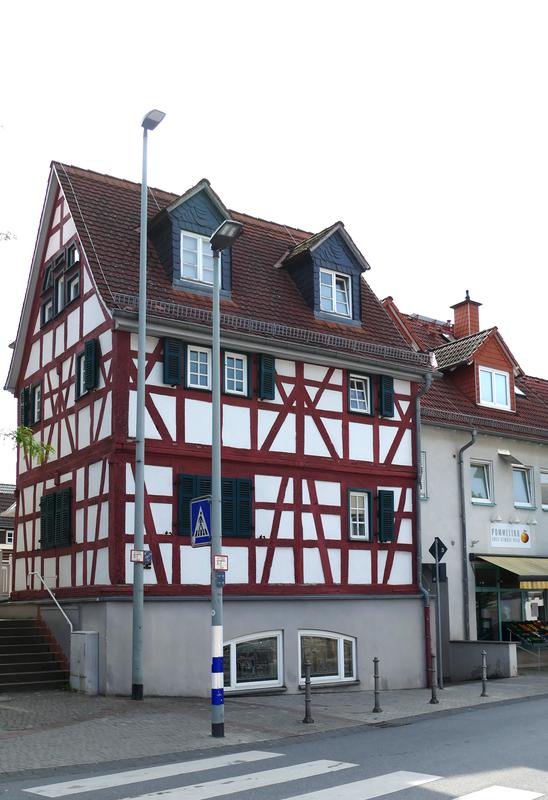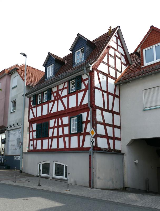 Markant an der Kreuzung Hauptstraße/Schwalbacher Straße gelegenes Fachwerkwohnhaus mit traufseitigem Geschossüberstand. Zweigeschossig, auf hohem Sockel, mit Satteldach, Zweiriegelige Rähmkonstruktion mit Mannfiguren und symmetrischen Streben, vermutlich zweite Hälfte des 18. Jahrhunderts errichtet.