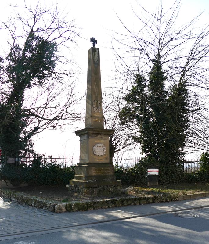 Gegenüber der Einmündung Wiesbadener Straße aufgestelltes Gefallenendenkmal von 1870/71 in Form eines Obelisken auf Sockel mit verziertem Hochheimer Wappen und eisernem Kreuz als Spitze.