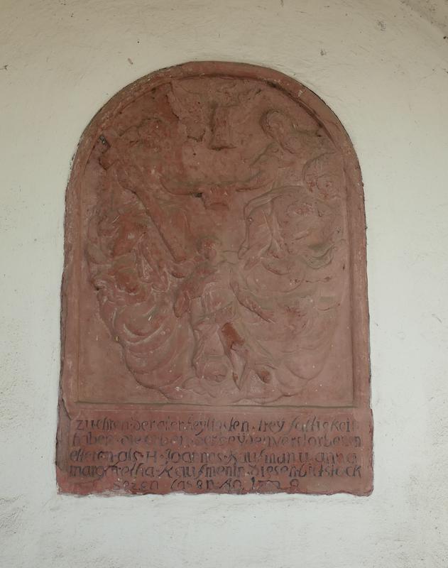 Rundbogiges Sandsteinrelief über einer Sandstein-Mensa, datiert 1729, in der Rückwand eines Heiligenhäuschens. Die Verwitterung der handwerklich wie künstlerisch qualitätvollen Dreifaltigkeitsdarstellung lässt darauf schließen, dass sie als Bildstock ursprünglich der Witterung ausgesetzt war. Inschrift: