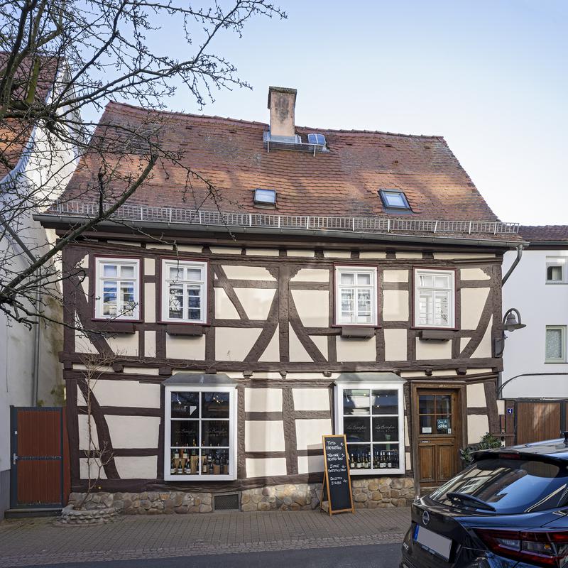 Rähmkonstruktion mit naturwüchsigen, verblatteten Schwellen, profiliertem Rähm, ausdrucksvollen Mannfiguren mit geschnitzten Kopfwinkelhölzern und gebogenen Streben sowie Andreaskreuz und Zierstreben, errichtet in der ersten Hälfte des 17. Jahrhunderts, Giebel später verändert.