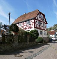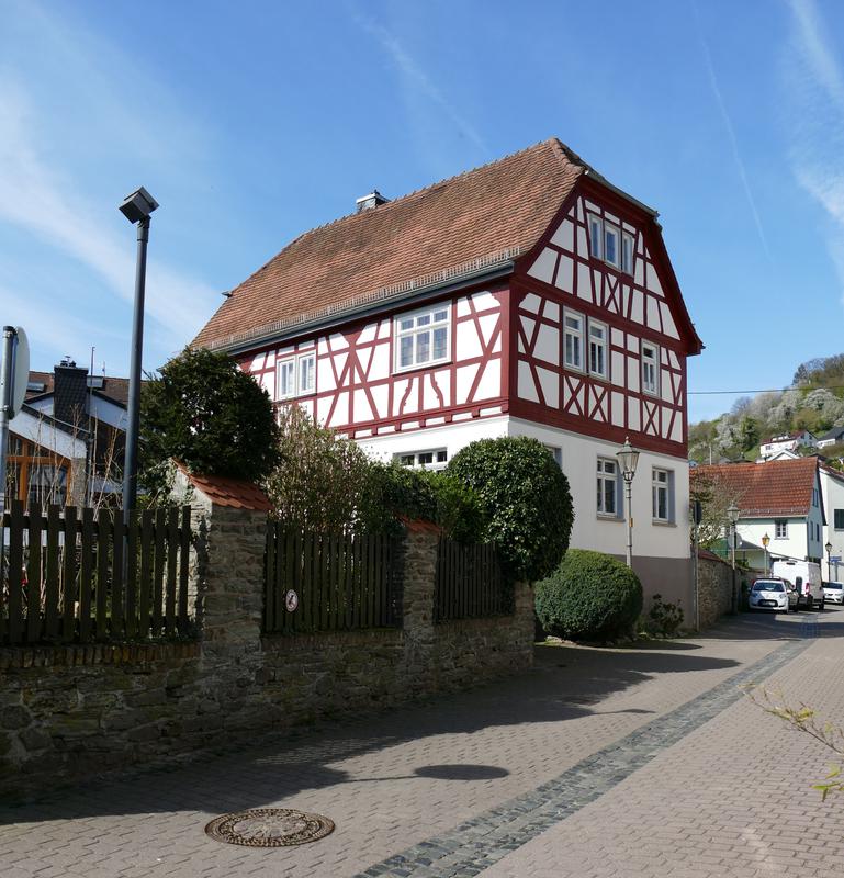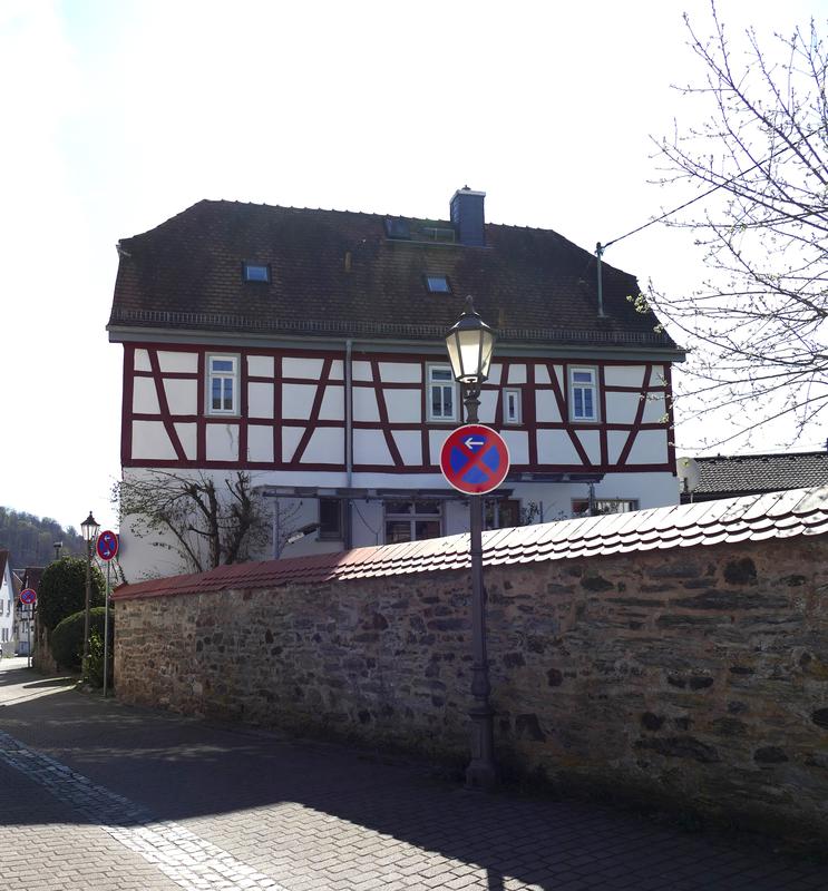 Pfarrhaus mit massivem, verändertem Erdgeschoss, darüber qualitätvolle, typische Fachwerkrähmkonstruktion der Zeit um 1720. Das Sichtfachwerk zeigt stark profilierte Schwelle-Rähm-Zonen, Mannfiguren an den Eckpfosten mit geschnitzten Kopfwinkelhölzern, Streben und Gegenstreben, Andreaskreuze und geschweifte Zierstreben in den Brüstungsgefachen. Die Anlage ist bestimmendes Element am Zimmerplatz.