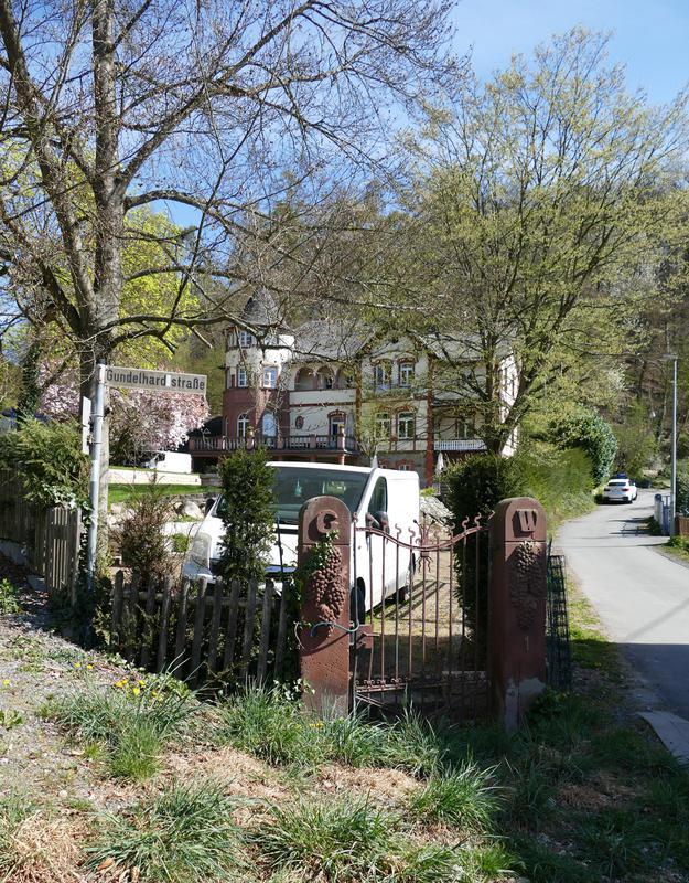 Erhalten haben sich Reste der historischen Einfriedungsmauer und ein altes Gartentor mit Sandsteinpfosten, darauf ein Weintraubenrelief und Initialen "GW".