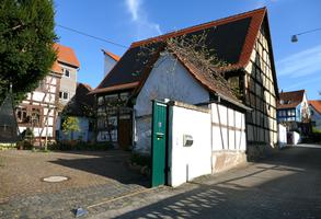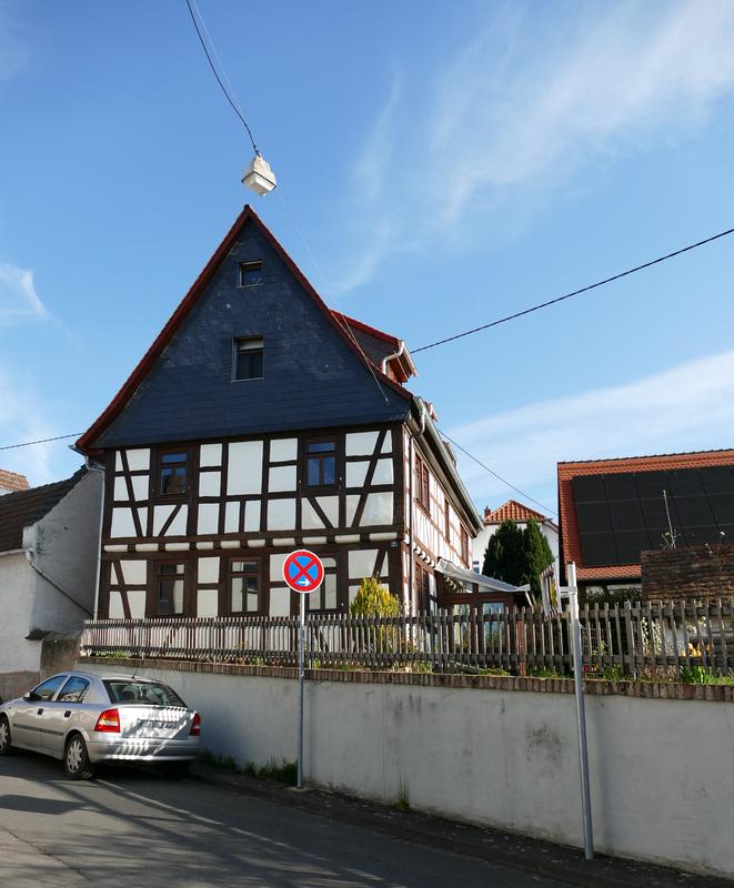 Giebelständiges, zweigeschossiges Fachwerkwohnhaus eines Zweiseithofes in markanter, erhöhter Ecklage. Rähmkonstruktion ohne Zierelemente, jedoch in sorgfältiger, dekorativer Verstrebung, um 1750, mit geschosshohen, symmetrisch angeordneten Hölzern, Geschossüberstand, verschieferter Giebel, Satteldach. Zugehörig die Fachwerkscheune des 18. Jahrhunderts, eine Schwellriegelkonstruktion mit lebhafter Verstrebung, teils Ziegel-, teils Lehmausfachungen. Von Bedeutung als originaler Bestandteil des Hofes und bestimmend im Straßenbild.
