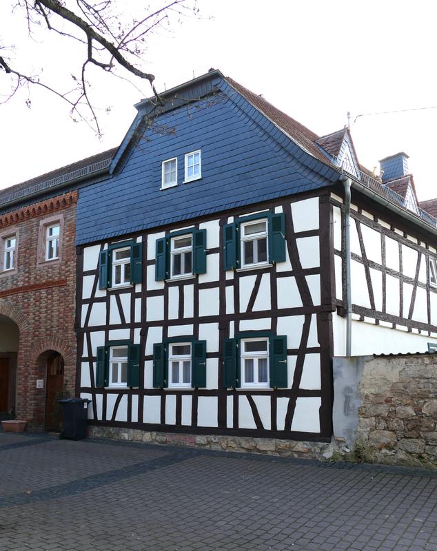 Das Wohnhaus besitzt traufseitigen Geschossüberstand, hier im Erdgeschoss massiv erneuert. Über Bruchsteinsockel Fachwerk in zweiriegeliger Konstruktion mit divergierenden Eckstreben. Erbaut vermutlich in der Mitte des 18. Jahrhunderts.