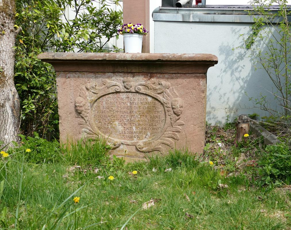 Neben Burgweg 25 steht der Sockel eines Wegkreuzes, datiert 1750, gestiftet von der Gemeinde Fischbach. Er ist aus einem rechteckigen Sandsteinblock gearbeitet, besitzt eine auskragende Deckplatte, auf der Vorderseite eine ovale Kartusche mit Inschrift, die von Rocaillen und Puttenköpfen gerahmt ist.