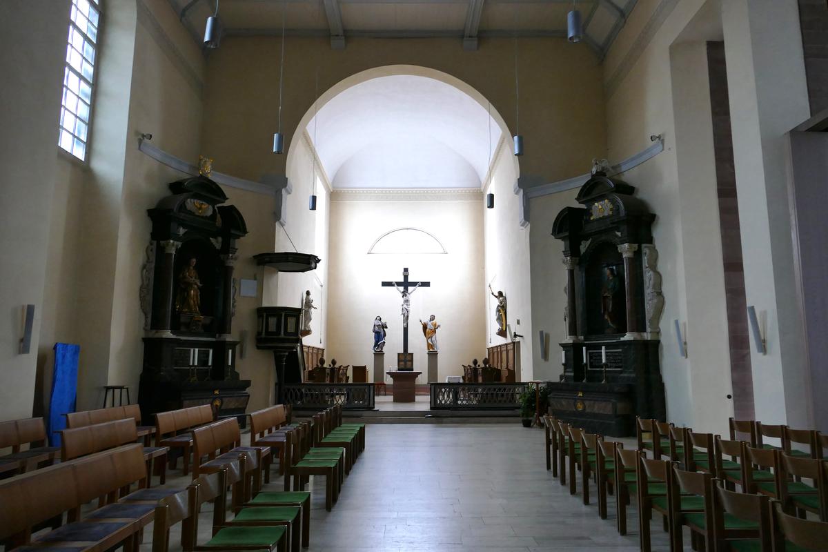 Ausstattung: In der alten Kirche Seitenaltäre 1685 und 1710 aus Kloster Eberbach, reiche Aufbauten aus schwarzem und farbigem (Stuck-)Marmor mit gekröpften Giebeln und Putten. Im Chor barocke Kreuzigungsgruppe und Figuren zweier weiblicher Heiliger, farbig gefasst. Kanzel 18. Jahrhundert, Orgel 1748 aus Pfungstadt von Joh. Christian Köhler. Osterleuchter um 1700, vierzehn Kreuzwegstationen erste Hälfte 19. Jahrhundert, Taufstein von 1723, bäuerliche Pietà. Barocke Immaculata im Neubau, ebenso barockes, gefasstes Kruzifix.
