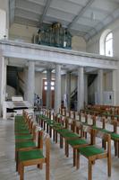 Im Inneren beeindruckend die Eingangsempore auf acht kräftigen tuskischen, marmorierten Holzsäulen mit Kassettendecke und klassischem Architrav, der die Empore bildet. Der Rechteckchor von Flachkuppel überspannt, Gesims mit Mäanderband und klassischem Eierstab.