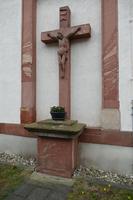 In die westliche Außenwand des Altbaus eingelassen Fragmente eines Sandsteinkreuzes sowie eines Grabsteines (?). Vor der Nordwand ehemaliges Friedhofskreuz aus Sandstein, der barocke Corpus detailreich gearbeitet.