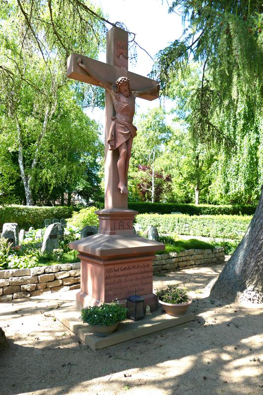Friedhofskreuz aus Sandstein, Steinmetzarbeit des 19. Jahrhunderts. Das einfache Kreuz steht auf einem Postament mit Inschrift, detailliert gestalteter Corpus. Vom alten Friedhof hierher versetzt.