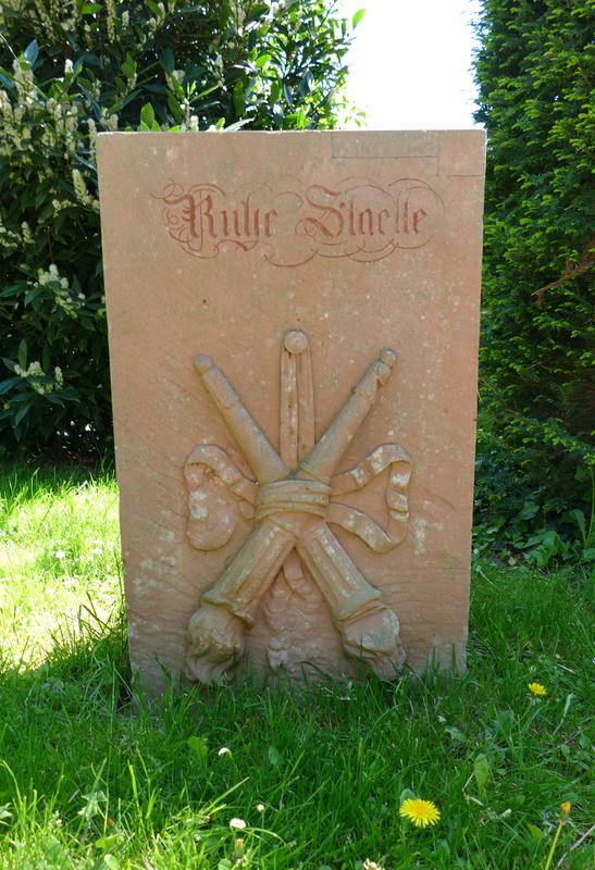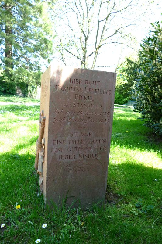 - Grabstein für Carl Friedrich Bickel (1768-1851, Kirchenrat und Pfarrer) und Caroline Henriette Bickel, geb. Stanarius (1779-1845). Blockhafter Sandstein mit der Darstellung zweier umgedrehter Fackeln.