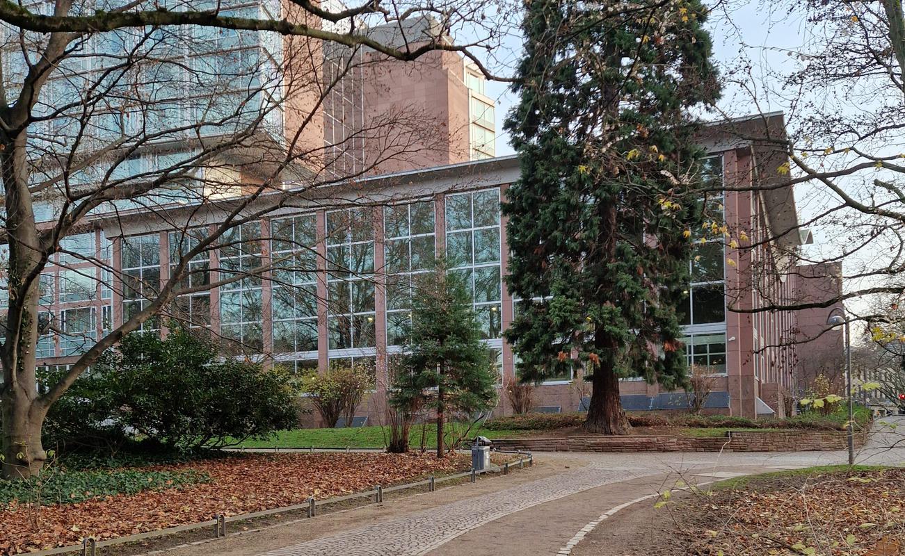 Modernes Hallenbad von 1959/60 nach Entwurf von Schneider & Bohnenberg. Im Winkel eher schlichter gestalteter Trakte eine schwungvoll verdachte und gegen die Wallanlagen verglaste Schwimmhalle.