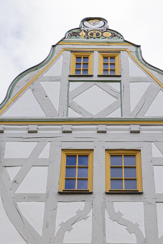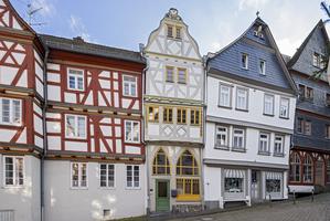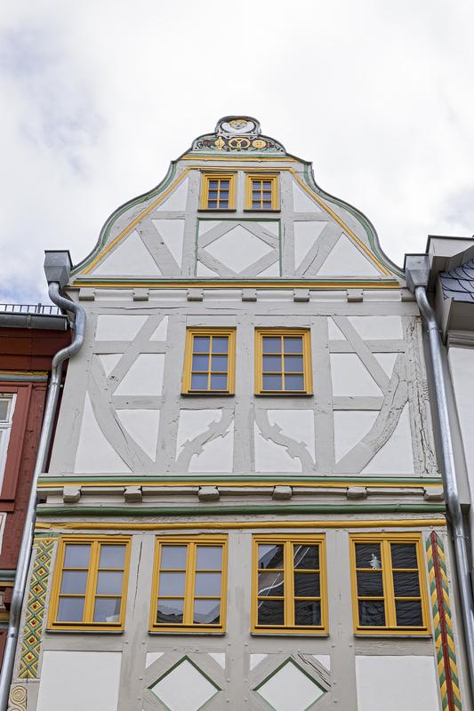 Das schmale, aber hohe verputzte Fachwerkhaus mit später unterteilter Erdgeschosshalle und zwei vorkragenden Obergeschossen sowie kleinem, verschieferten Schweifgiebel besetzt eine Parzelle auf der Nordseite der platzartig erweiterten Brückengasse. Eine genauere bauhistorische Einschätzung des Gebäudes ist aufgrund der Verputzung nicht möglich, jedoch lässt dessen Kubatur eine Entstehung um 1600 - evtl. mit mittelalterlichem Kern - möglich erscheinen. Die Besitzergeschichte ist ab dem späten 15. Jahrhundert lückenlos durch regelmäßige Gültzahlungen an das Kloster Eberbach sowie das „Grüne Haus" belegt. Wahrscheinlich seit 1684 wird durch den Bäcker Tripp eine Backgerechtigkeit für das Haus erworben, welches in der Folge als Wohn- und Backhaus firmiert. 1768 letztmalige Erwähnung einer Backstube.