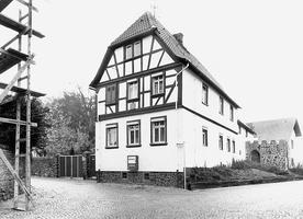 Das Anwesen wird örtlich als Junkernhof, als Burgmannenhof überliefert. Es wird im Süden begrenzt von der alten Assenheimer Stadtmauer, die hier noch erhalten ist. Als Hauptgebäude ist ein zweigeschossiger Fachwerkwohnbau mit hochliegendem Keller anzusehen, der aus der Zeit um 1700 stammt. Im Erdgeschoß sehr schöne Fenster noch aus dem 19. Jahrhundert erhalten.