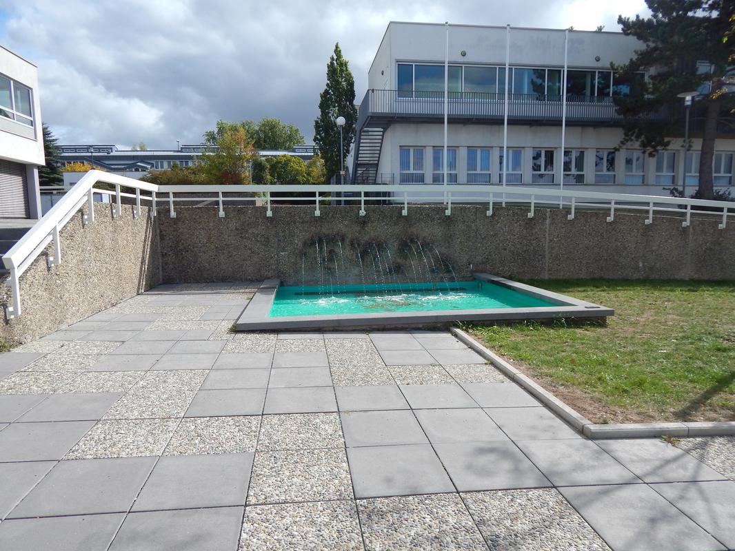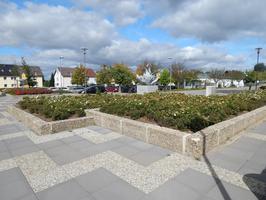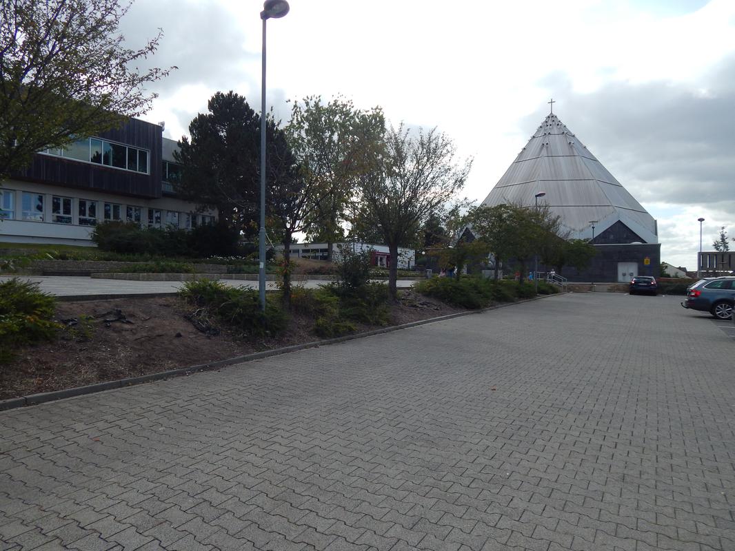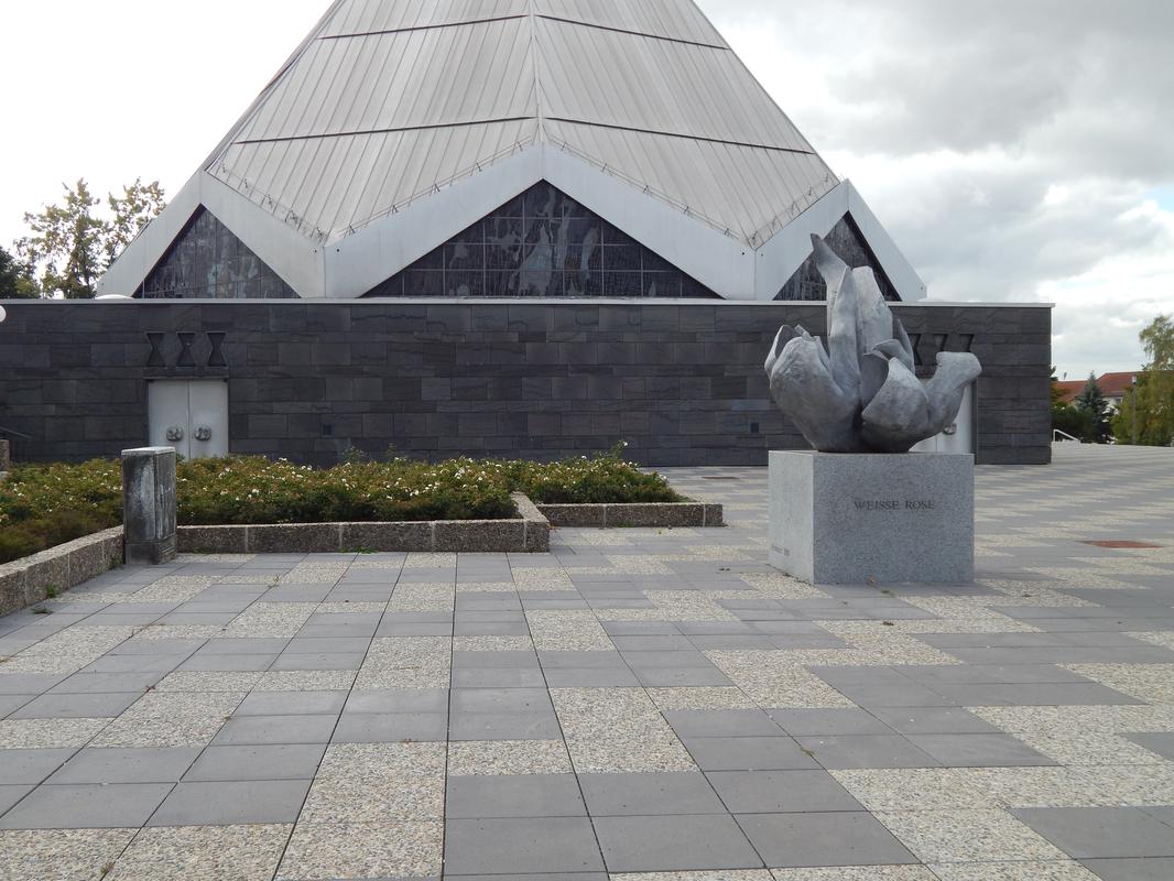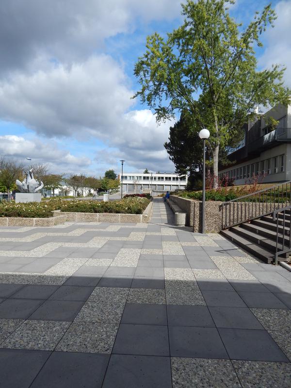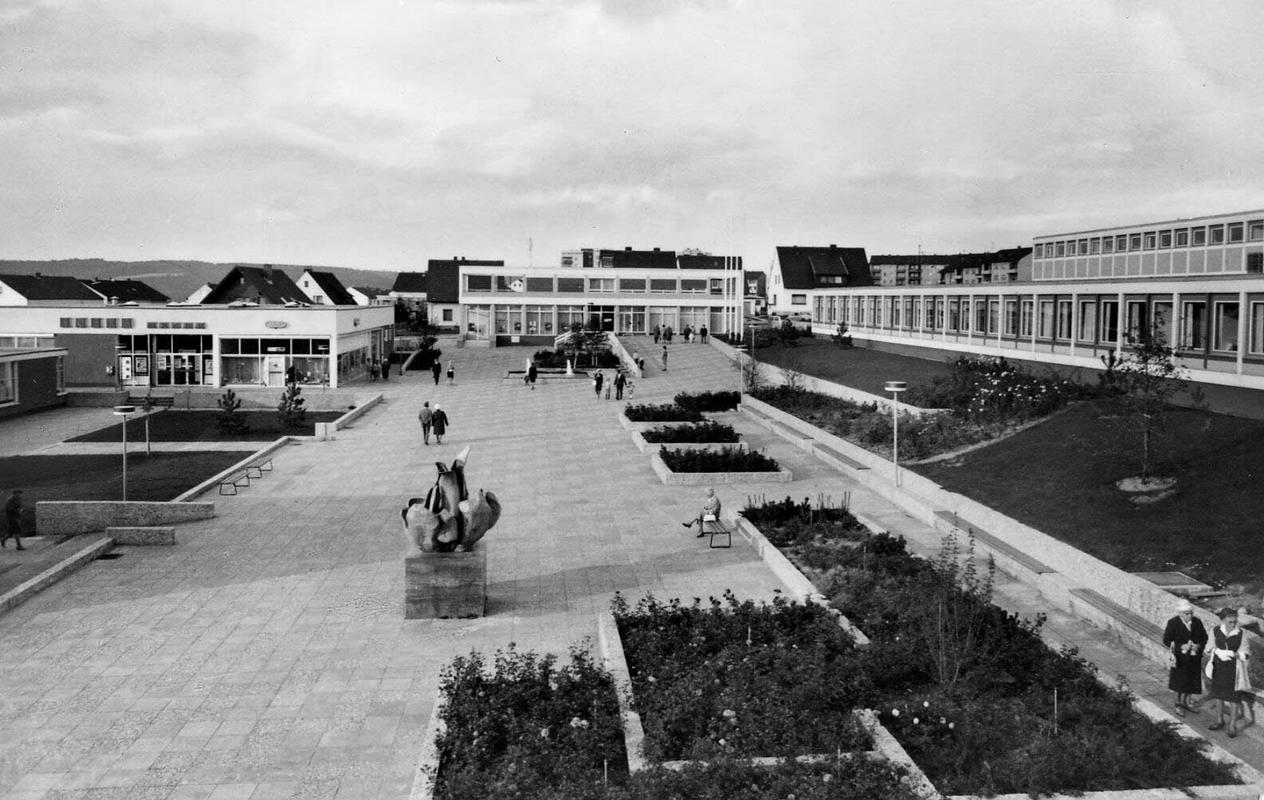 Zentrale Platzanlage mit rahmender bzw. begleitender Bebauung. Entstanden ab 1961/62 nach Entwurf des Architekten Prof. Dr. Herbert Rimpl (1902-1978, Wiesbaden). Auf dem nach Osten ansteigenden Gelände entlang der Goerdelerstraße gelegen, ursprünglich mit zwei, nur wenig höhenversetzten Terrassen angelegt. Die erhaltene Hauptachse des Platzes eingespannt zwischen dem zweigeschossigen Sparkassengebäude im Norden und der Kirche mit Gemeindezentrum St. Paulus im Süden. Im Osten von Brunnen- und Grünanlagen, gemauerten Bänken und locker gruppierten quadratischen Beeten gesäumt. Die Namen gebende Skulptur der "Weißen Rose" von Inga von Sternburg (1940-2018, Tochter Rimpls) nördlich vor der Kirche platziert. An einem der Brunnenbecken "Kunst am Bau" in Form von kleinen Bronzeköpfen, Phantasiewesen darstellend, als Wasserspeier an der Stützmauer befestigt.
