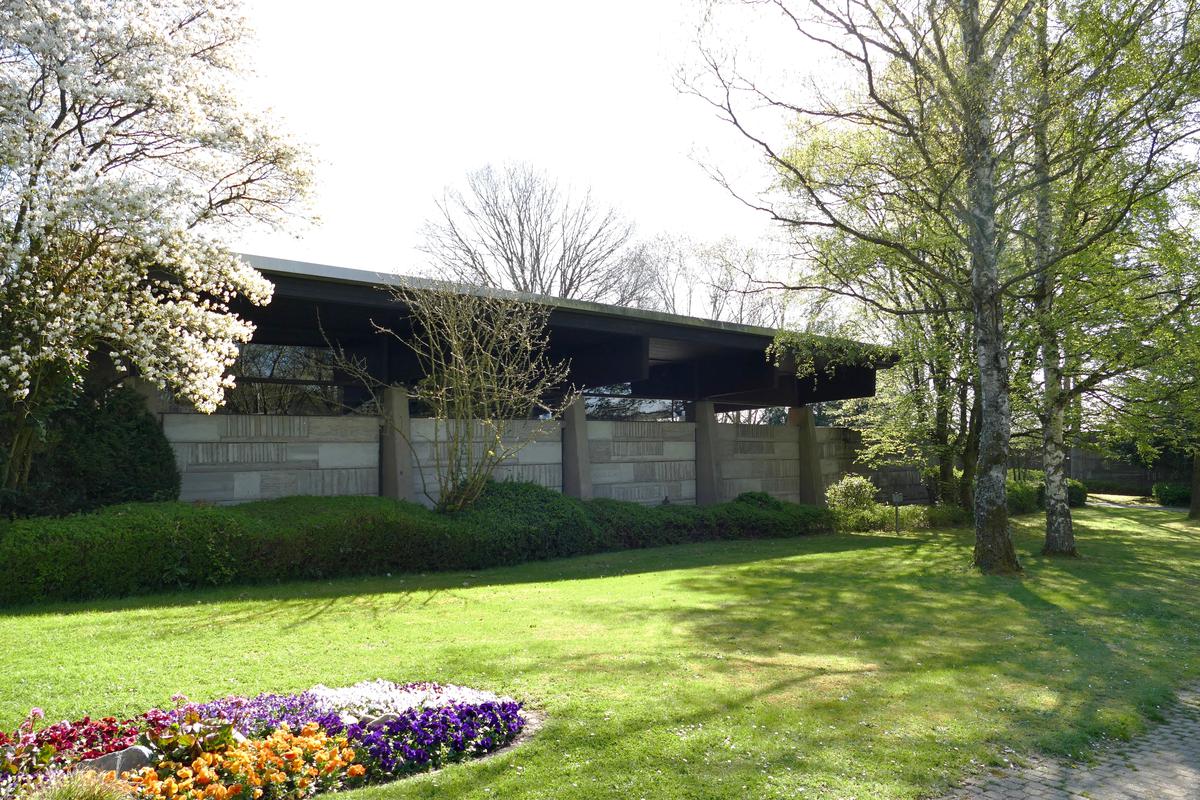 Der Friedhof entstand in Folge der Zusammenlegung der Gemeinden Kelkheim, Münster und Hornau in verkehrsbestimmter, zentraler Lage nach den Entwürfen des Kelkheimer Architekten Friedrich E. Rosenberg (Planung 1969, Eröffnung 1972). In der Südostecke des als Park konzipierten Areals liegt die prägnante Baugruppe. Ihre Grundelemente sind zwei verschieden große Betonmauerzüge mit gerundeten Ecken. Die äußere, winkelförmige Hauptmauer fasst den Gesamtbereich und ist gleichzeitig Ostwand der Trauerhalle. Die U-förmige, innere Mauer, gegenständig eingelegt, bildet deren Westwand. Das Leichenhaus gliedert an die östliche Außenseite an. Als bestimmendes Element zitieren die Mauerzüge die Einfriedung historischer Friedhöfe. Die Trauerhalle selbst wird baulich aus ihnen entwickelt und tritt eigenständig nur mit ihrer besonderen Dachform zutage. Die Mauern werden von glatten Betonpfeilern unterbrochen, somit Wand und Stützen bewusst getrennt. Auf die Pfeiler sind die hängenden Holz-Leimbinder aufgelegt. In der Ansicht erinnern sie deshalb an typische Toranlagen ostasiatischer Tempelbezirke. Die Belichtung der Halle erfolgt durch die Glaswände der Ein- und Ausgangsseite, die so als transitorischer Raum und portalartiges Bauwerk erscheint. Das Betonmauerwerk besteht aus Großquadern, deren Sichtflächen beim Guss durch die Einlage von verschiedenen Hölzern (Schwarten, Stangen etc.) plastisch ausgeformt wurden. Die Mauern werden somit zu Bildträgern der Natur und ihrer Formen. Charakteristisch für die Architektur Rosenbergs ist ihre ruhige Großzügigkeit, ihr konstruktiver Rationalismus sowie ein bejahender Umgang mit den typischen Materialien dieser Zeit, insbesondere mit dem Baustoff Beton. Die Anlage war bereits bei ihrer Fertigstellung stark beachtet, mehrfach publiziert und für den Deutschen Betonpreis nominiert. Als hervorragendes Beispiel der späten Nachkriegsmoderne ist sie Kulturdenkmal aus künstlerischen und architekturgeschichtlichen Gründen.