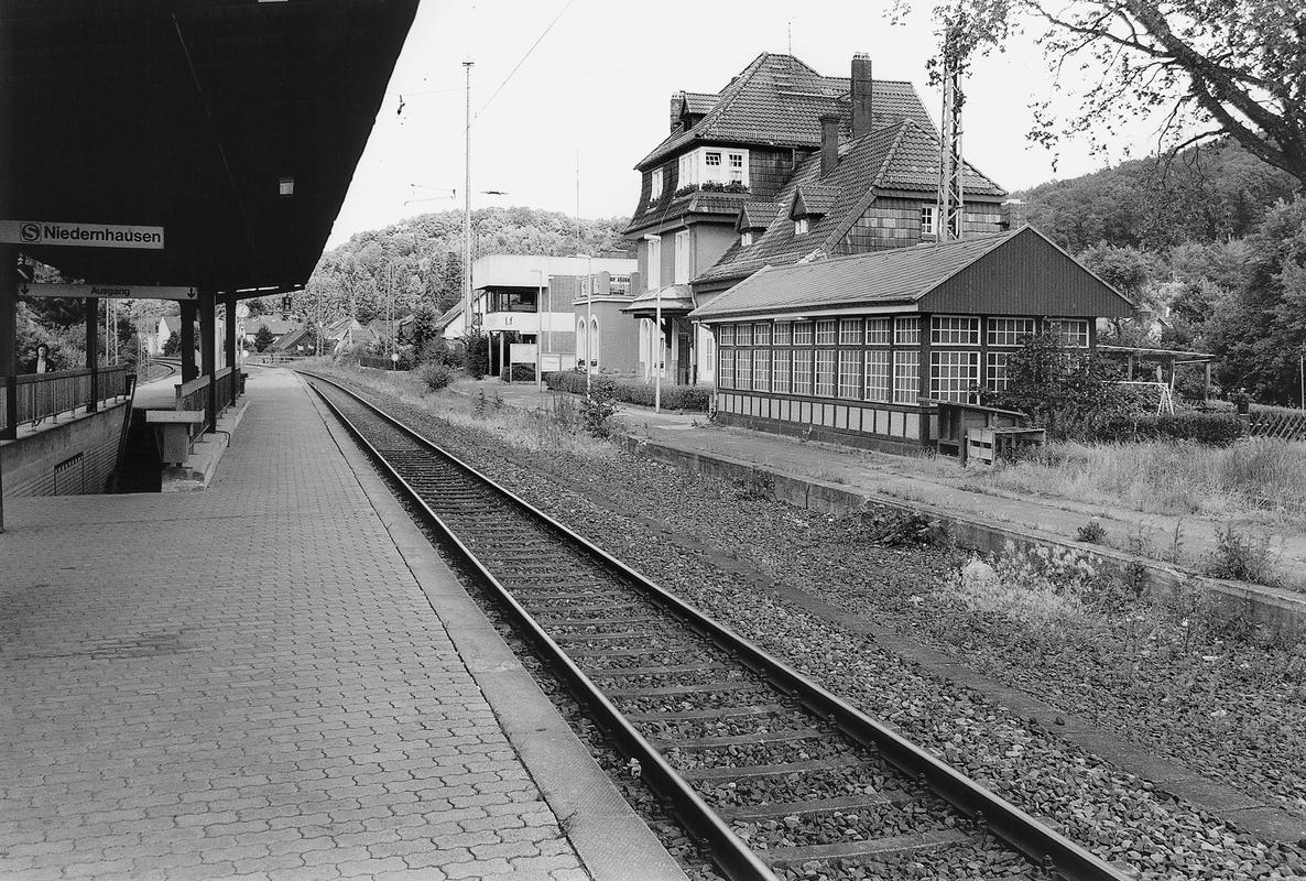 Doppelgeschossiger Putzbau auf Sandsteinsockel mit Mansarddach bzw. Giebel und Terrasse im Gebäudewinkel zur Strecke. Treppe zur Unterführung in Fachwerk mit großzügigen Sprossenfenstern überbaut.