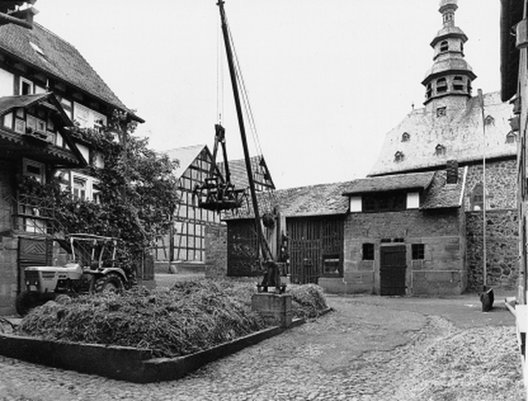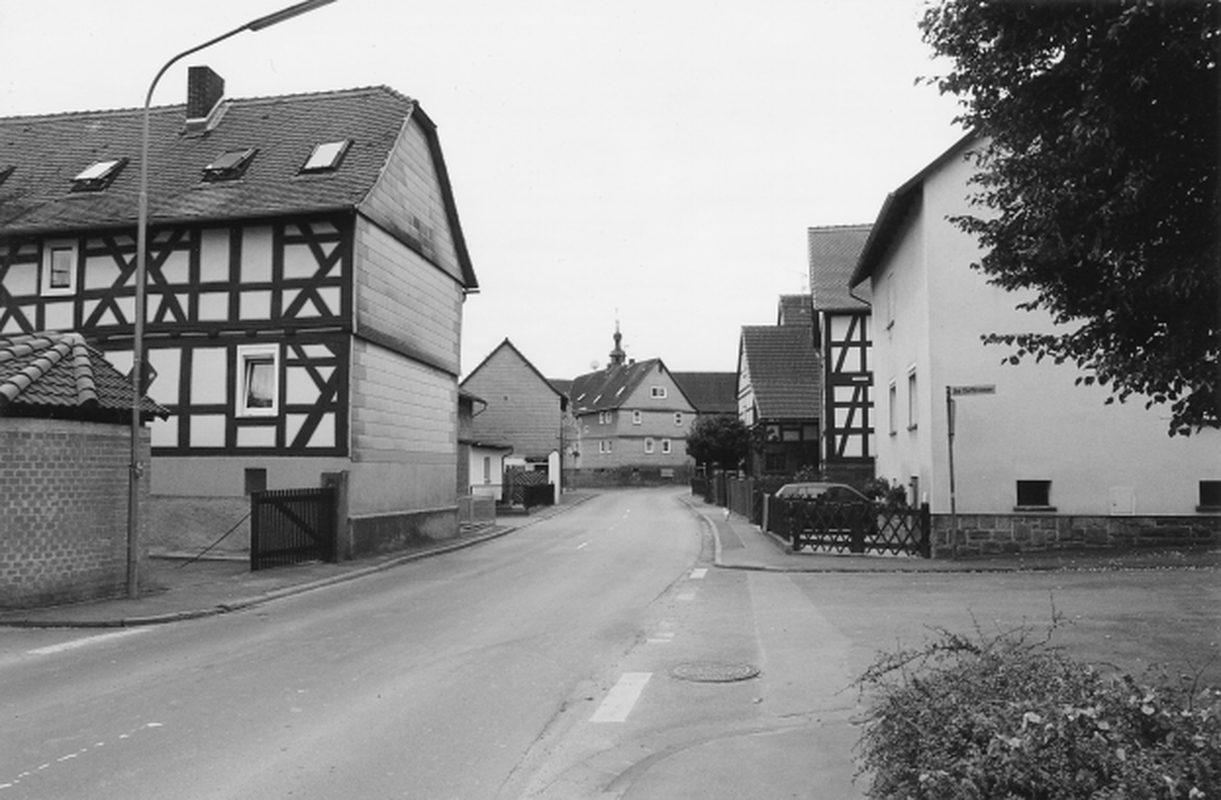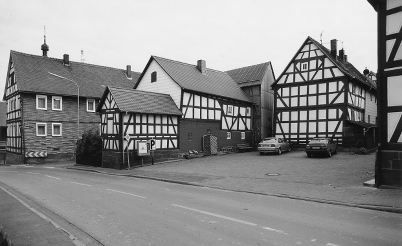 Die Gesamtanlage von Roßdorf orientiert sich im Kern an dem seit dem Mittelalter bestehenden Ortsgrundriß, der durch das Geviert aus Vorderstraße, Untere Wallecke, Hinterstraße und Oberstraße gebildet wird und bereits vor 1400 im Verlauf dieser Straßen von einem Graben umgeben war. Den Mittelpunkt dieses Gevierts bildete der Kirchhof. Im Zuge der Dorferweiterung und der hessisch-mainzischen Auseinandersetzungen zu Beginn des 15. Jhs. wurde der im Kataster von 1808 eingezeichnete erweiterte Wallgraben angelegt. Er erwies sich als notwendig, da Roßdorf als ein der Mainzer Herrschaft unterstehendes Dorf durch seine Lage in der Nähe der Langen Hessen, der Städteverbindung Frankfurt-Leipzig, insbesondere während des Dreißigjährigen Krieges besonderer Gefährdung ausgesetzt war. Der Grabenverlauf ist noch heute in Form eines annähernd rechteckigen Umrisses nachzuvollziehen; er folgte im Osten der Burggartenstraße, im Süden der Eulenstraße und im Norden bzw. Nordwesten der Straße Am Dorfbrunnen. Nach Südwesten hin verlief der Graben gerade hinter der Bebauung der Oberstraße, die abwechselnd von jeweils traufständigen Wohnhäusern und Scheunen bestanden war, die hier eine wehrhaft geschlossene Reihe bildeten. Die heute im hinteren Hofbereich angesiedelten Wirtschaftsgebäude wurden auf der Grabenfläche errichtet. Diese Erscheinung läßt sich auch an anderen Stellen des Dorfgrundrisses nachweisen (Burggartenstraße, Am Dorfbrunnen). In zentraler Lage innerhalb des alten Ortskerns liegt der Kirchhof, der ebenfalls am Beginn des 15. Jhs. Zu einem Wehrkirchhof vergrößert wurde. Anzumerken und erklärlich aus den oben geschilderten Umständen ist die Besonderheit in der Bebauungsstruktur, die sich durch die Anordnung der großen Hofanlagen im inneren Dorfbereich und die der kleinen Anwesen zur Peripherie hin manifestiert. Diese Anordnung verstärkt sich noch im Laufe des 19. Jhs. durch die Auflassung des Wallgrabens. Hier entstand im Bereich Eulenstraße über dem ehemaligen Grabenverlauf eine geschlossene, auf einem hohem Sockelgeschoß errichtete Bebauung etwa gleich dimensionierter Wohnwirtschaftsgebäude durch Handwerker und Tagelöhner. Das ursprüngliche Aussehen der in der zweiten Hälfte des 19.Jhs. gebauten, heute teilweise überformten Häuser läßt sich noch an Eulenstraße 5 und 13 ablesen. Als herausragend im Bereich der oberhessischen Dörfer ist die Bebauung um den Kirchhof herum anzusehen. Die hier aufgereihten Hofanlagen fügen sich mit ihrer weitgehend ungestörten Bausubstanz zu einem außergewöhnlich intakten historischen Ortsbild. Als Beispiel ist Kirchstraße 5 anzuführen. Hier ist der an die Kirchhofsmauer angebaute Schuppen bis hin zum originalen Holzschloß erhalten, und das Wohnhaus verfügt neben Fachwerkschnitzereien noch über das Vordach und die barocke Freitreppe aus der Bauzeit. Die in Roßdorf überlieferte Bausubstanz stammt in ihren frühesten Belegen aus der zweiten Hälfte des 17. Jhs., in der Masse jedoch aus dem 18. und 19. Jh. Neben seltenen Fachwerk-Ständerkonstruktionen (wie bei den Wohnhäusern Vorderstraße 2 und Oberstraße 8) herrscht dabei das Rähmgefüge vor, das sich hier durch die Verwendung von kräftigen Fachwerkhölzern und reich ausgebildeten Mannfiguren mit breitstehenden Verstrebungen besonders auszeichnet. Zumeist sind die Hofanlagen als Hakenhöfe mit einem dicht an der Straße stehendem, giebelständigen Wohnhaus angelegt (Vorderstraße, Kirchstraße). Die gebogenen Straßenverläufe führen auf diese Weise immer wieder zu optisch interessanten Staffelungen und Betonungen einzelner Baukörper.