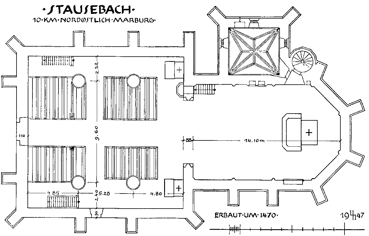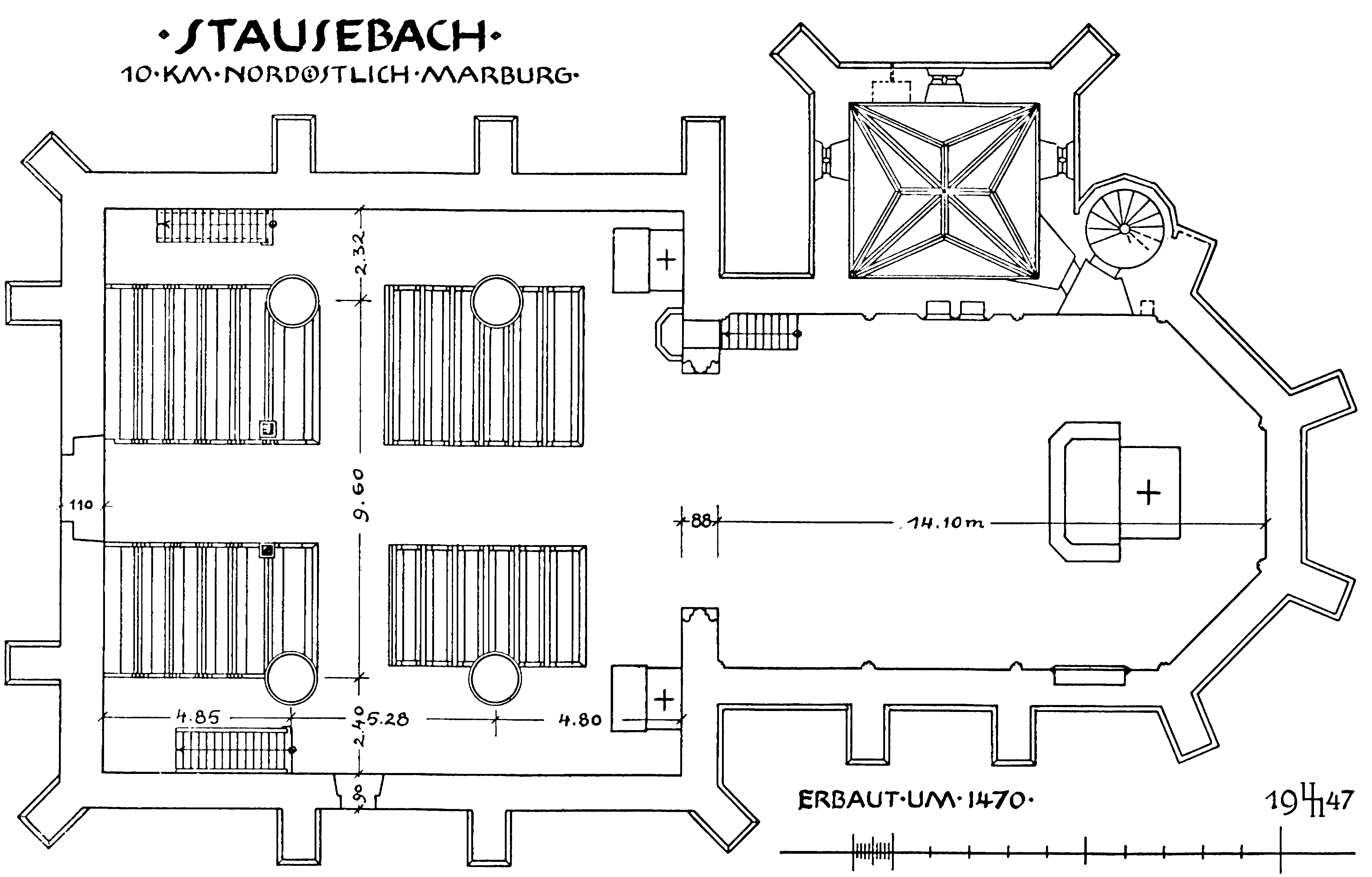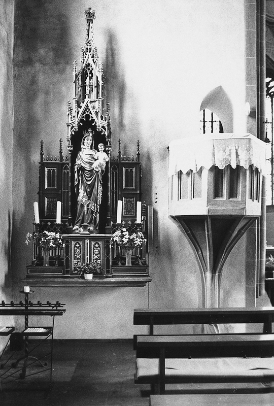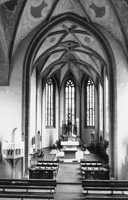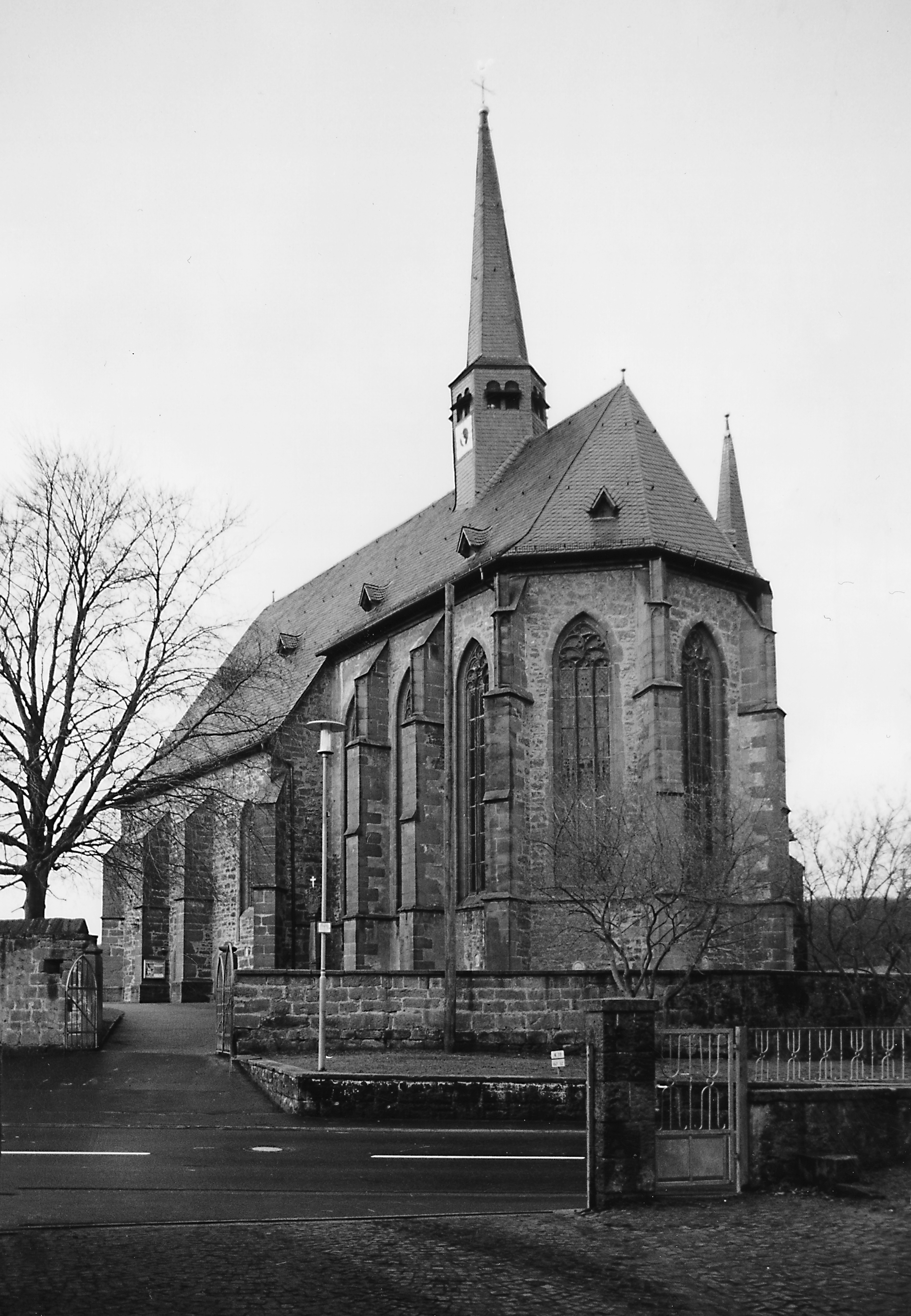 Die der Himmelfahrt der Gottesmutter Maria geweihte Kirche steht hoch aufragend ganz im Westen am Übergang in die Feldflur. Sie ist von einem Wehrkirchhof umgeben, den eine mit Schießscharten ausgestattete Mauer umzieht. Diese gibt durch einen großen Torbogen den Zugang zum neuen Friedhof frei. Das Kirchengebäude vom Deutschen Orden etwa um 1470 als ein spätgotischer Hallenbau mit Chor aus zwei Jochen und 5/8-Schluß errichtet. An der Nordwand des Chores ein Treppentürmchen mit eigener Turmspitze und die gotische Sakristei, als Hauptturm ein sechseckiger Dachreiter. Das breite, etwas höhere Mittelschiff wird von zwei sehr schmalen Seitenschiffen begrenzt, die mit reichen Netz- und Sterngewölben versehen sind, welche im Chor auf schlanken Dienstbündeln, im Langhaus auf Rundpfeilern ruhen. In den Gewölbekappen farbig getönte Stukkaturen von Mainzer Künstlern um 1730. An den Stirnwänden der Seitenschiffe zwei das Raumbild bestimmende Altäre des 19. Jhs., die im neugotischen Hochaltar stehende Muttergottes von 1527. Am Chorbogen eine spätgotische Steinkanzel mit Maßwerkblenden. Auf der mit ornamentaler Bemalung erhaltenen, auf 1656 datierten Westempore die von Daniel Heitze 1719 erbaute Orgel. In der Sakristei ein Vesperbild aus der Mitte des 15. Jhs., wohl das ehemalige Wallfahrtsbild, und eine etwa spätere Muttergottes; die 14 Kreuzweg-Stationsbilder des 18. Jhs. wurden später im Inneren angebracht. An der Außenseite ein zwischen zwei Strebepfeilern plaziertes Kriegerehrenmal mit neubarockem Inschriftstein und Kruzifix. Desweiteren sind einige figürliche Reliefs sowie eine Sonnenuhr unbekannter Datierung in das Mauerwerk eingefügt. Die Wehranlage ist durch einen spätbarocken, reich gearbeiteten Bildstock von 1746 ergänzt, der sich auf einem altarähnlichen Steintisch und dem leicht geschwellten vierkantigen Pfeiler erhebt. Inschrift im Unterbau: "KOMMET ALLE ZU MIR DIE IHR MIT MÜH UND ARBEIT BELADEN SEYD UND ICH WILL EUCH ERQUICKEN MATTH.II V.28".