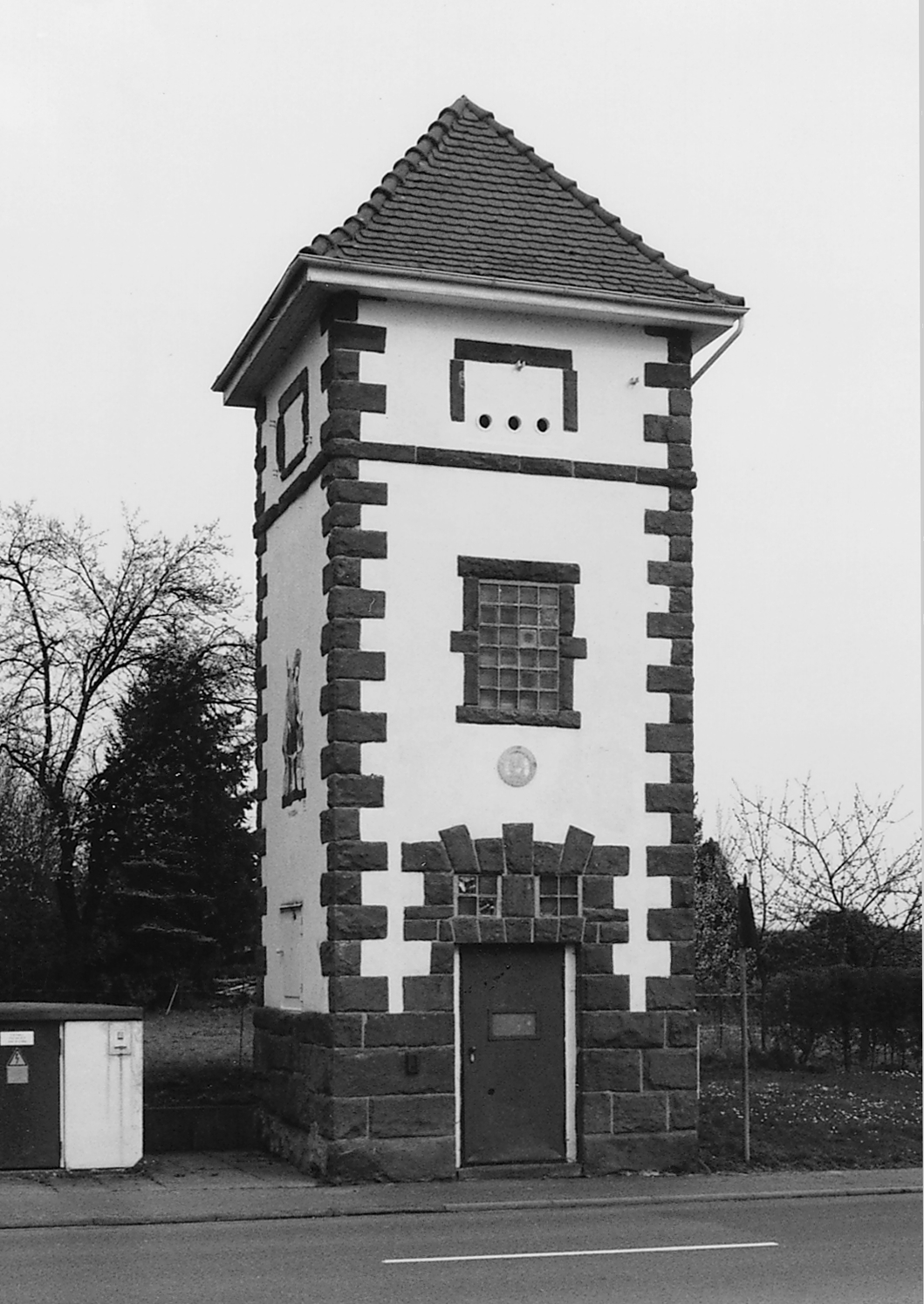 Auf quadratischem Grundriß errichtetes turmartiges Massivgebäude auf Sockel in Rustikamauerwerk. Die glatte Putzfassade ist durch die Sandsteinquaderung der Ecken und einen Zierstreifen unterhalb des Zeltdaches gegliedert. Das ehemalige Transformatorhaus, heute Schlauchturm der Feuerwehr, ist als technisches Kulturdenkmal des frühen 20. Jhs. von Bedeutung.