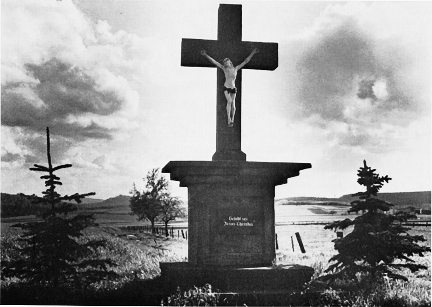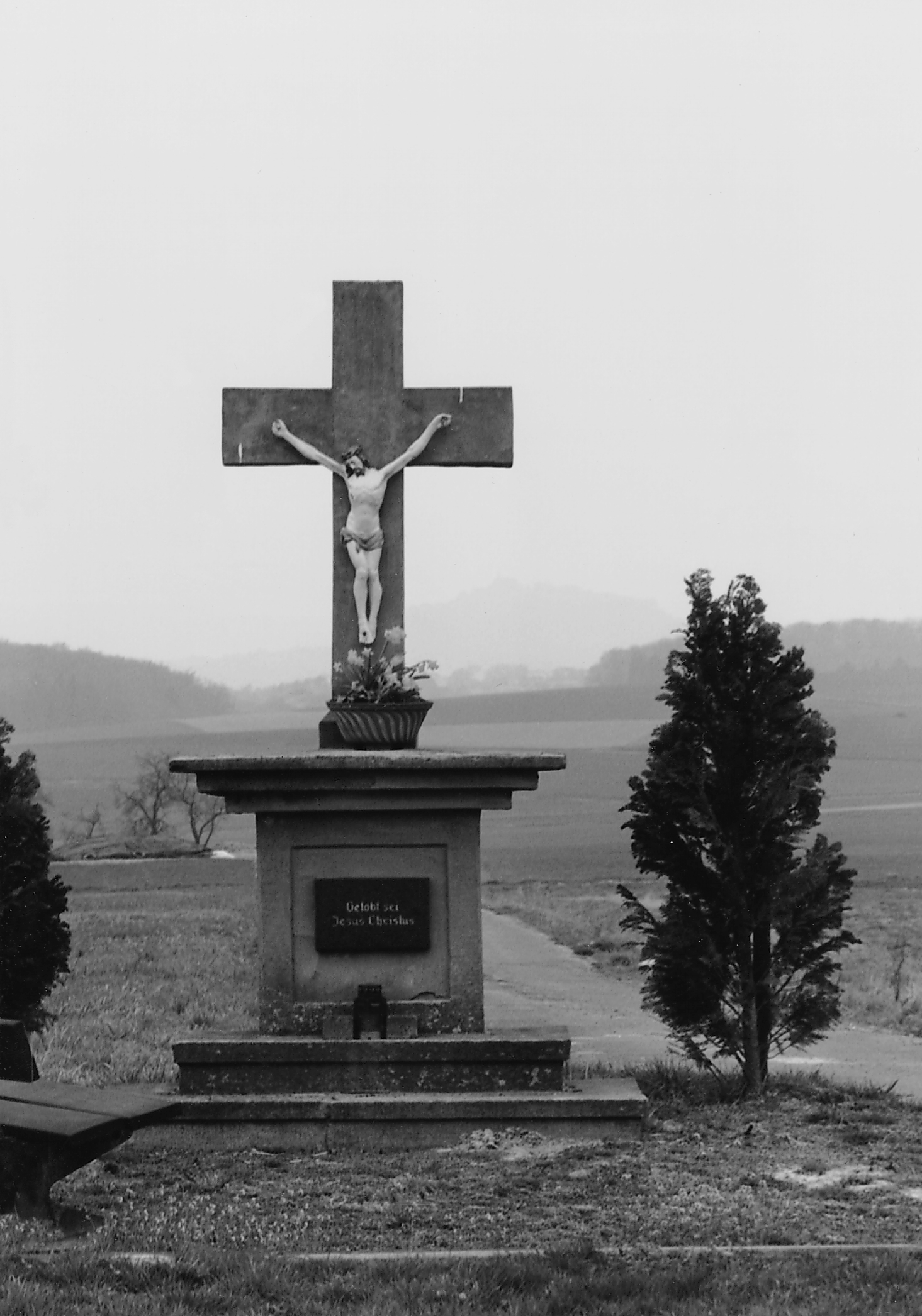 An der Verbindungsstraße von Emsdorf nach Allendorf zwischen einer Baumgruppe aufgestelltes Kruzifix mit kleinem, älterem Metallkorpus. Der in Werkstein über zwei Stufen errichtete altarartige Unterbau ist durch eine weit vorkragende, gestufte Platte abgeschlossen, darüber ein massiges Kreuz. Inschrift im Sockel: "Gelobt sei Jesus Christus". Die Anlage wurde 1948 am Ort und unter Verwendung des alten Korpus erneuert.