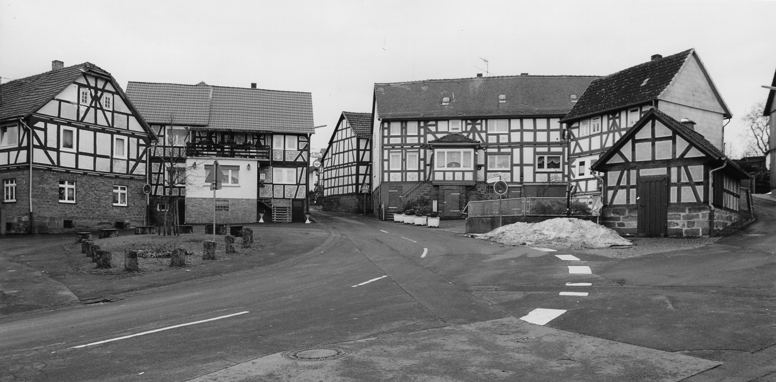 Die Gesamtanlage der Gemeinde Burgholz erschließt in ihren wesentlichen Teilen die historische Bausubstanz entlang der Wohratalstraße, der Emsdorfer Straße, dem Lindenplatz sowie dem Burgweg. Die Hauptgruppe der denkmalgeschützten Einzelbauten gruppiert sich an der von Nordost nach Südwest verlaufenden Achse Wohratalstraße-Lindenplatz mit Übergang in den Kirchhainer Weg. Zu Beginn dieser Achse bilden die Hausnummern 3 / 6 der Wohratalstraße durch ihre giebelständigen, dicht an der Straße stehenden Wohnhäuser eine städtebauliche Torsituation aus. Diese findet am Lindenplatz durch die Hausnummern 5 / 10 ihre Entsprechung, hier bilden die beiden giebelständig gegenüberstehenden Bauten eine räumlich wichtige Platzeinfassung. Burgholz brennt laut Überlieferung 1768 bis auf wenige Häuser ab. Die heute vielfach durch Um- und Anbauten veränderte Bausubstanz der Einzeldenkmäler entstammt folglich der zweiten Hälfte des 18. Jhs., als Hofformen sind zwei Dreiseithöfe, einige Zweiseitanlagen und ein Streckhof mit Auszugshaus zu nennen. Bis auf die in neuerer Zeit entstandene Kratzputzausstattung am Haus Lindenplatz 5 weist das Fachwerk in dem seit jeher wenig begüterten Dorf keine besonderen Schmuckformen auf. Vom Lindenplatz aus, auf den nahezu alle Straße sternförmig zulaufen, gelangt man in Richtung Südwesten den Hang hinauf zur Kirche. Der ganz in Werkstein errichtete, gut erhaltene Bau erfährt durch den ansteigenden, von der Bebauung eingeengten Burgweg und den über dem Eingang eingestellten Glockenturm eine starke Akzentuierung. Hinter der Kirche schließt sich der Friedhof an, nach Nordosten reicht bis an den Waldrand eine breite, vom Aussichtturm bis zu der Straße Am Katharinenbrunnen sich erstreckende Zone von Streuobstwiesen und Gärten. Die Gesamtanlage zieht sich in diesem Bereich bis zu der etwa 50 m im Wald liegenden Hunburg, einer ehemaligen karolingischen Curtis, die sich auf einer Bergzunge über dem Wohratal ausbreitet. Der südliche Dorfrand wird von dem schon etwas abseits des Ortskernes gelegenen Forsthauses begrenzt, im Osten des Kirchhainer Weges ist der Bebauung eine Streuobstwiese vorgelagert.