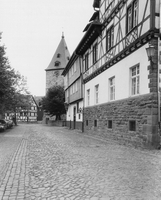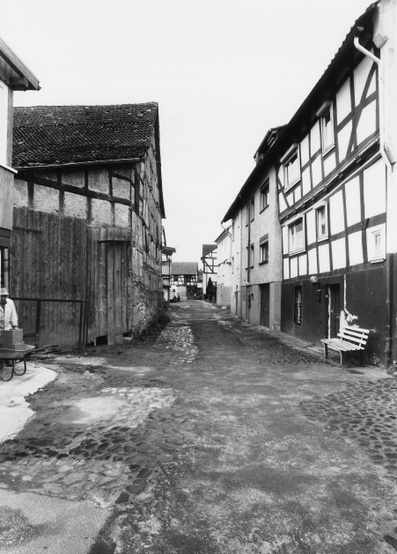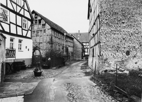 Als ein Gebiet, das im unmittelbaren Zentrum des Altstadtkernes gelegen in sehr hoher Dichte bebaut ist, verdient der Bereich nördlich der Marktstraße besondere Erwähnung. Im engen Verlauf der Kreuz- und Mainzergasse und begrenzt durch die halbkreisförmig umschließende Bogenstraße drängen sich niedrige, teilweise bis heute bewirtschafte Kleinsthofanlagen und dreigeschossige Ackerbürgerhäuser. Anhand des inschriftlich auf 1624 datierten Baus Kreuzgasse 11 läßt sich ein Gebäudebestand registrieren, der zum Teil bis in die Zeit nach 1556 zurückreicht, als große Teile der Stadt im Zuge einer Belagerung abbrannten.