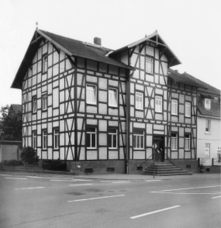 Zweigeschossiges Wohnhaus, das wesentlich zum Straßenbild der Bahnhofstraße beiträgt, die sich als östliche Stadterweiterung im Zuge des Bahnhofneubaus entwickelte. Hochaufragender Fachwerkbau mit Ziegelsteinausfachung, das Dach mit Kniestock und Ausbildungen von Ziergespärren an den Giebelseiten und am zentral über dem Eingang plazierten Zwerchhaus; der First knaufbesetzt. Vor der aus der Bauzeit erhaltenen Haustür eine dreiseitige, sandsteinerne Freitreppe. Die Aussteifung des Fachwerks ist durch geschoßhohe Andreaskreuze sehr dekorativ gehalten. Als Bauzeit sind die Jahre zwischen 1880 und 1895 anzusetzen.