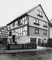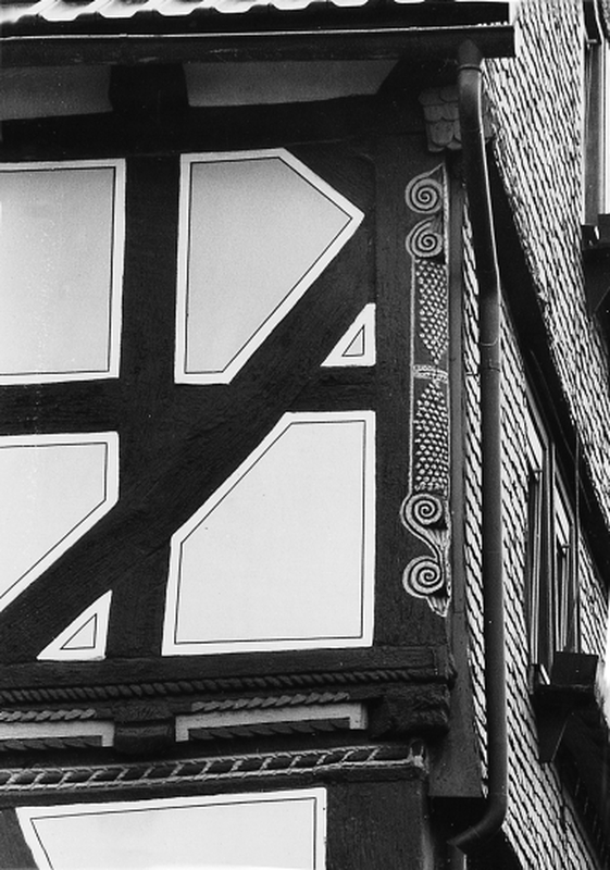 Giebelständiges Wohnhaus auf hohem Sockel, in dem ehemals der Stall untergebracht war, die Haustür des tiefliegenden Eingangs aus dem 19. Jh. ist erhalten; umlaufender Geschoßversprung mit Taubandverzierung an Schwelle und Rähm, die Eckstiele durch geschuppte Säulen mit Doppelschnecken geschmückt, das in starken Hölzern errichtete Fachwerk durch gebogene, geschoßhohe Streben ausgesteift. Bauzeit wohl noch vor 1700.
