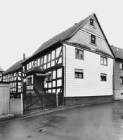 Winkelhofanlage bestehend aus giebelständigem Einhaus und zur Mauerstraße parallel verlaufender Scheune aus dem Ende des 19. Jhs. Das Haupthaus ein Rähmbau mit Scheunenzone im hinteren Bereich; das Fachwerk mit Schnitzverzierung am Geschoßwechsel läßt auf eine Entstehung in der ersten Hälfte des 18. Jhs. schließen. Die den hohen Sockel überwindende Freitreppe teilerneuert.