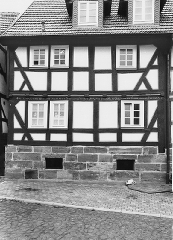 In mehreren Bauphasen entstandenes Fachwerkgebäude vom Typ eines Einhauses; der linke Teil mit hohem Unterbau, in dem der Stall zu ebener Erde unter dem Wohnteil plaziert war, entstammt noch dem 18. Jh., hier leichter Geschoßversprung am Rähmstockwerk und breitstehende Streben mit Fußgegenstrebe; der Scheunenteil rechts wurde im späten 19. Jh. angefügt. Rähminschrift: "Dieses Haus hat erbaut Johann Heinrich Diezel uvd seine Ehe Frau Kristina Nollin Der Zimmermeistr war Anton Gieserich von Allen…".