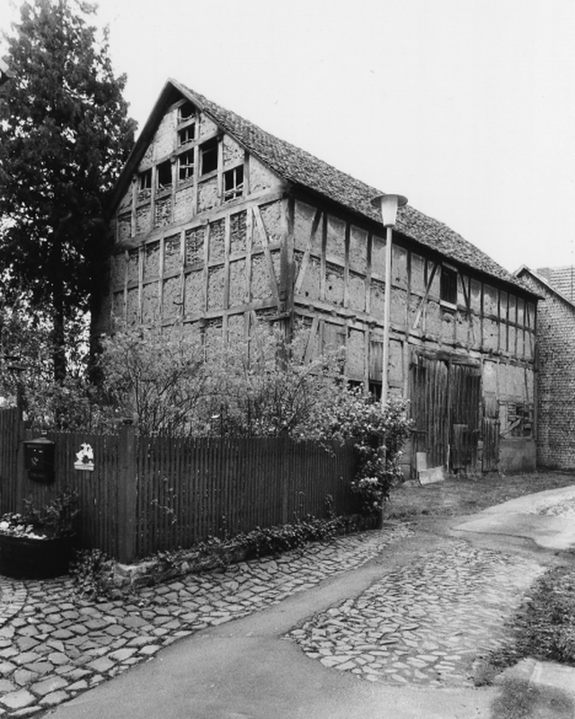 Traufständiges, im engen Straßenraum etwas zurückweichendes Scheunengebäude, in seinem Gerüst gut erhaltener Fachwerkbau auf Werksteinsockel, das Dach mit handgestrichenen Biberschwänzen gedeckt, die konstruktiven Verstrebungen lassen eine Datierung für das letzte Drittel des 19. Jhs. zu.