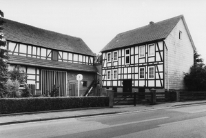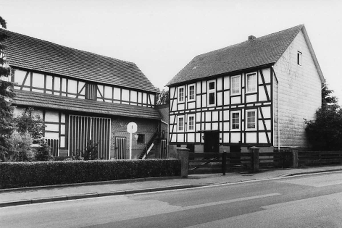 Winkelförrmig angelegte Hofanlage mit giebelständigem Wohnhaus, ein Fachwerkbau auf hohem Werksteinsockel, in dem der Stall untergebracht war, klare fünfachsige Gliederung mit zentralem, eingetieften Eingang; unter der Plattenverkleidung ist ein für das ausgehende 19. Jh. Typisches konstruktives Fachwerk mit geschoßhohen Streben zu errwarten; die Hofanlage steht aufgrund ihres weitgehend originalen Zustandes und als Beleg für das Weiterleben der historischen Haus- und Hofformen am Ende des 19. Jhs. aus geschichtlichen Gründen unter Denkmalschutz.