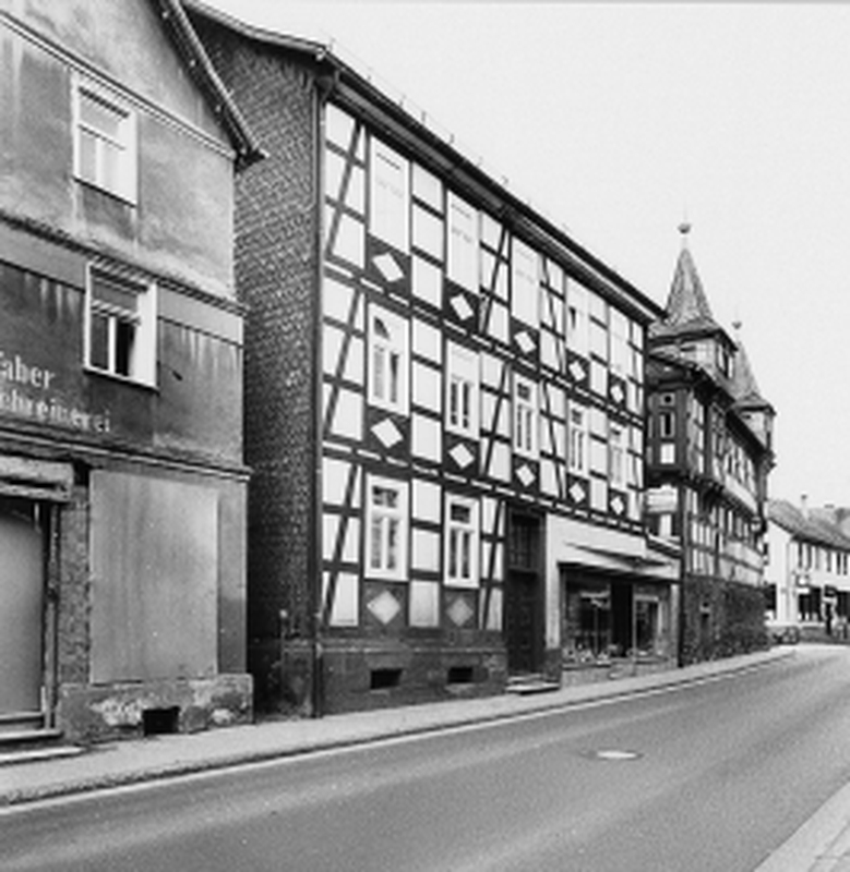 Traufständiges dreigeschossiges Wohn- und Geschäftshaus in symmetrischer fünfachsiger Fensterordnung, das konstruktiv angelegte Fachwerk mit konvergierenden Streben und dekorativen, durch Rauten verzierten Brüstungsfeldern; aus der Bauzeit hat sich der eingetiefte, zentraler Eingang mit originaler Kassettentür erhalten. Im rechten Bereich des Erdgeschosses massive Veränderungen durch Ladeneinbau. Der dem alten Rathaus benachbarte Bau ist um 1880 entstanden und aus städtebaulichen sowie baugeschichtlichen Gründen erhaltenswert.
