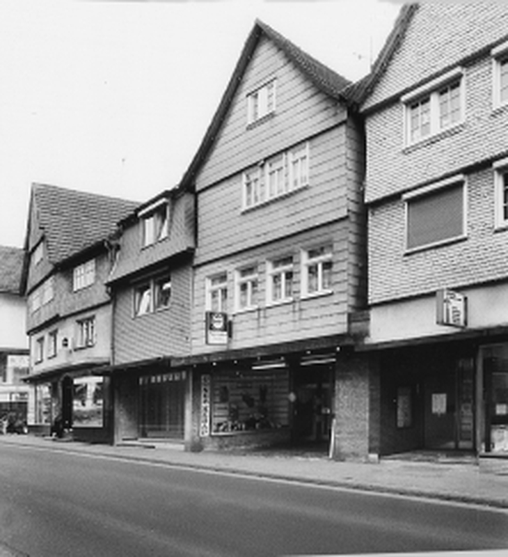 Giebelständiger, dreigeschossiger Fachwerkbau als wichtiges Element der geschlossenen Bebauung in der Marktstraße. Im Erdgeschoß durch Geschäftsnutzung massiv erneuert, unter dem Plattenbehang ist die Auskragung der Geschosse erkennbar, darunter ist Fachwerk mit Mannverstrebungen zu vermuten. Die Bauzeit ist noch im 17. Jh. anzusetzen.