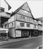 Dreigeschossiges Fachwerkgebäude in städtebaulich wichtiger Position gegenüber dem Rathaus und als Eckhaus zur Kreuzgasse; giebelständiger Bau mit unter der Verkleidung erkennbarem Geschoßversatz, an der linken Giebelseite Taubandverzierung am Geschoßwechsel; der wohl noch im 17. Jh. entstandene Bau ist im Erdgeschoß und Teilen des Obergeschosses durch Ladennutzung massiv erneuert.