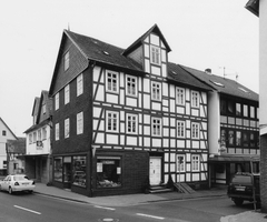 Städtebaulich bedeutsames, dreigeschossiges Wohn- und Geschäftshaus an der Ecke zur Bogenstraße; für das 19. Jh. Typischer Bau in konstruktivem Fachwerk, zweiseitig erschlossen, klare symmetrische Fassadengliederung, in der Mittelachse der Traufseite kleines Zwerchhaus, rechts neben dem Eingang mit der originalen Haustür ein Kellerhals erhalten; die Giebelseite des in der ersten Hälfte des 20. Jhs. Entstandenen Baus verkleidet mit Holzschindeln. Erdgeschoß durch Ladeneinbau teilweise massiv erneuert.