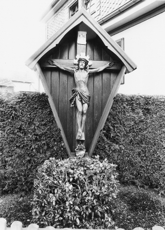 Kruzifix unter Spitzgiebelbedachung, ursprüglicher Standort an der Marburger Straße, 1940 an den jetzigen Standort versetzt, das hölzerne Kreuz mit Titulus und eichenem Korpus, der laut Überlieferung aus dem 18. Jh. stammt. Ortsgeschichtliche Bedeutung als Beispiel für die in katholischen Gemeinden gepflegte Tradition, an den Ausfallswegen religiöse Bildwerke zu plazieren.