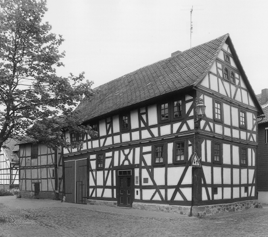 Traufseitig erschlossener Fachwerkrähmbau unmittelbar gegenüber der Kirche. Am leicht vorkragenden Geschoßwechsel Profilierung an Balkenköpfen und Rähm; reich ausgebildete Mannverstrebungen, an den Eckstielen Schnitzverzierung in Form von Säulen mit als menschlichem Kopf ausgebildetem Kapitell; erhalten die kassettierte Eingangstür des 19. Jhs. mit Oberlicht und ein darüber angeordnetes Andreaskreuz als Fachwerkschmuckform. Unter den höherliegenden Wohnräumen ehemals der Stall untergebracht, der Eingang mit Ern ebenerdig erschlossen, im hinteren Teil war die Scheune angeordnet. Das als Einhaus im 17. Jh. entstandene Gebäude beherrbergt heute das Stadtarchiv von Neustadt.