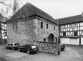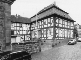 Zur Straße offene Dreiseithofanlage aus giebelständigem Wohnhaus, Zehntscheune und Wirtschaftsbau als Verbindungstrakt. Der Wohnbau ist eine Fachwerkrähmkonstruktion auf hohem Werksteinsockel, an den durch K-Streben mit Halsriegel ausgesteiften Eckstielen sind Säulen als Schnitzverzierung eingearbeitet, am Giebelrähm die Inschrift: "soli deo gloria durch Gottes Hülfe churfürstliche Gnad und Freunde that bin ich zum Burcksitz auf dieser Stadt und mich den 24ten junij 1738 erbauet hat Herr Baron Koeth de Wanscheidt in die Neustadt". Die aus der Renaissancezeit stammende Zehntscheune ist massiv in Bruchstein errichtet mit Eckquaderung und großem rundbogigen Tor, unter dem wohl später entstandenen Mansarddach ist das karniesgeschmückte Dachgesims erhalten. Der durch barocke sandsteinerne Torpfosten zur Straße abgegrenzte Hof beherrbergt heute das katholische Pfarrhaus. Der Hof ist urkundlich als Burgsitz der Familie von Linsingen aus Jesberg erwähnt.