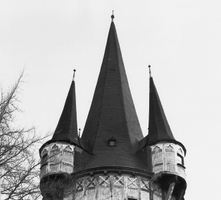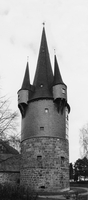 Den südlichsten Punkt der Stadtbefestigung bildet der ursprünglich in die Mauer hineingestellte Junker-Hansen-Turm. Errichtet unter Hans von Dörnberg (1427-1506), Hofmeister der Landgrafen Heinrich III. und Wilhelm III. von Hessen- Marburg. 1481-83 wurde er als Teil der Stadtbefestigung durch den in landgräflichen Diensten stehende Festungsbaumeister Hans Jakob von Ettlingen erbaut, dem u. a. das Marburger Schloß und die Burg Schweinsberg in der näheren Umgebung zugeschrieben werden. Die zwei unteren Geschosse des Turmes sind sorgfältig aus Sandsteinquadern aufgemauert, darüber zwei Fachwerkstockwerke mit spitzem Helm und vier vorgekragten, auf geschwungenen Kopfbändern ruhenden Wachtürmchen ebenfalls mit hohen Spitzhelmen. Im Unterbau breite Schießscharten, in der Mauerstärke eine Wendeltreppe, das Fachwerk der oberen Geschosse in spätgotischer Konstruktion mit genasten Andreaskreuzen als Schmuckelementen. Der über 50 m hohe und im Durchmesser etwa 13 m messende Turm gilt als größter Fachwerkrundbau in Europa.