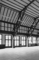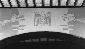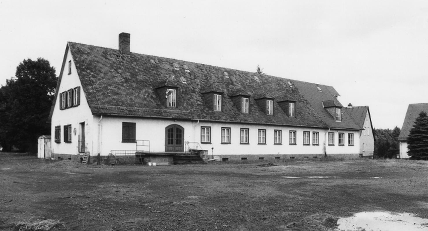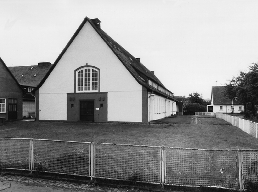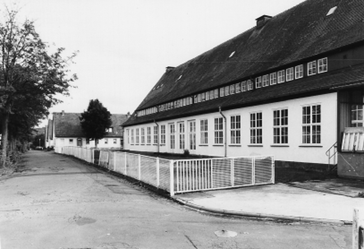 Großvolumiger, in H-förmigem Grundriß angelegter Baukörper mit vorgelagerter Platzanlage. Erbaut 1939/40 als Kantine und Versammlungsbau für die Siedlung Am Steimbel, die der Unterkunft der in den WASAG-Sprengstoffwerken beschäftigten Mitarbeiter diente. Zwei gleichgroße, parallel angeordnete Gebäudeteile mit steilem Satteldach und nahezu gebäudebreiter Schleppgaube sind durch einen kleineren Zwischenbau verbunden. Dieser beherrbergte die Zentralküche, die die beiden Speisesäle andiente. Der vordere Saal ist mit seiner Bühne auch für Film- und Theatervorführungen vorgesehen gewesen. Die Ausstattung der Säle ist in dem sichtbar gelassenen, auf Holzstützen ruhenden Dachtragwerk, dem Hartholz-Dielenboden und der Wandvertäfelung nahezu unverändert erhalten. Am vorderen Bau befindet sich an der linken Giebelseite ein portalartiger, sandsteingefaßter Eingang, über dem sich die Konsolen für die Aufstellung der ehemaligen nationalsozialistischen Hoheitszeichen bewahrt haben. Im Inneren ist neben einer farbigen Ausgestaltung der Gefache durch florale Kratzputzmotive die Stirnwand mit dem Bühnenausschnitt durch eine allegorische Szene geschmückt, die in einer Art Kratzputztechnik auf die Wand aufgebracht wurde. Beidseitig eines zentralen Reichsadlers sind mittelalterlich anmutende Windallegorien, die zwei fliegende Kraniche beflügeln, dargestellt. Links zur Fensterseite hin ist eine stilisierte Kogge, ein Handelsschiff der Hanse im 15. Jh., abgebildet, zu der offenbar die darunter dargestellte Schiffskanone mit drei Kugeln Munition gehört. Vermutlich gibt es eine dazu symmetrische Abbildung auf der anderen Seite der Bühne, die jedoch durch den Einbau eines Fahrstuhles verdeckt ist. Dieser wurde in der Zeit eingebaut, in der die Strumpffabrik ERGEE die Gebäude zu Lagerzwecken nutzte und in den Saal zur Steigerung der Kapazität eine zweite Ebene eingezogen hatte. Die Firma, deren Mitarbeiter in der Siedlung Wohnung fanden, stellte ihre Produktion 1993 auch in dem benachbarten Industrieareal ein.