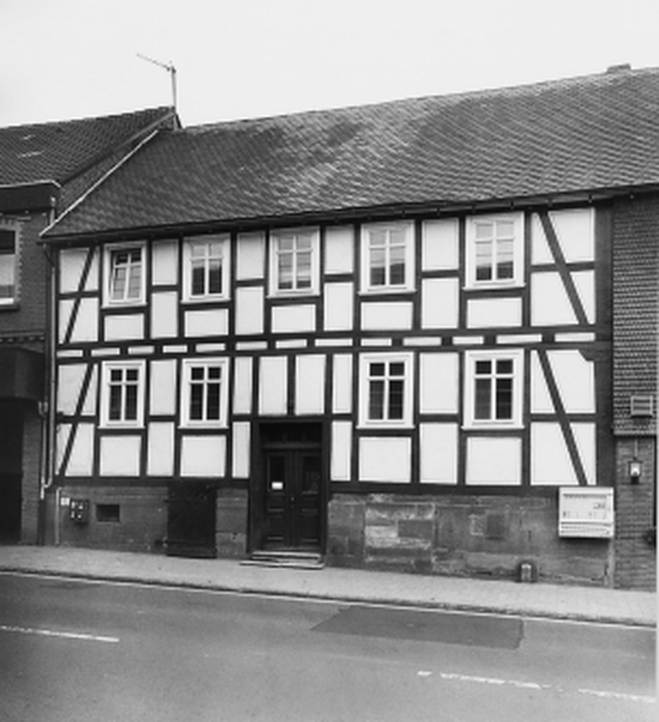 Gut erhaltenes Wohnhaus als Teil der geschlossenen Bebauung der Bahnhofstraße, traufständiger Fachwerkbau auf halbhohem Werksteinsockel, regelmäßig in fünf Achsen gegeliedert, als Aussteifung rein konstruktive, konvergierende Streben. Die originale Haustür aus der Bauzeit noch vorhanden. Der in der zweiten Hälfte des 19. Jhs. entstandene Bau setzt mit seinem eingetieften Eingang die Tradition des Ernhauses fort.