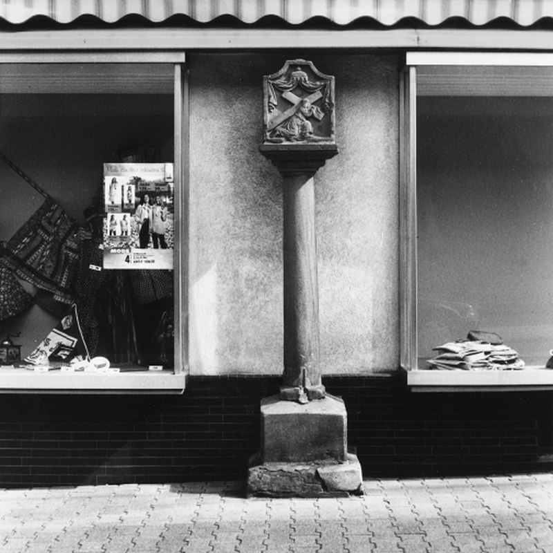 Vor dem Haus Bahnhofstraße 9 zwischen zwei Schaufenstervitrinen plazierter Bildstock; auf Bodenplatte und Blockpostament Säule mit gestuftem Kapitell, darüber Aufsatz mit Viertelkreisecken. Als Motiv im Relief die kreuztragende Christusfigur unter einem Baldachin mit Vorhang. An der rechten Seite Darstellung des hl. Antonius von Padua, links des hl. Franziskus. Inschrift auf der Rückseite des Aufsatzes: "J H S DIESEN BILDSTOCK HABEN ZUR EHRE GOTTES MACHEN LASSEN HEINRICH GIES ANA SEIN E.F. SCHMIT MEISTER ANNO 1736".