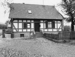 Giebelständiges, eingeschossiges Wohn- und Wirtschaftsgebäude, ehemals Teil einer ursprünglich aus dem 18. Jh. stammenden herrschaftlichen Hofanlage, deren sandsteinerne Hoftorpfosten noch überliefert sind. Der sehr gut erhaltene, 1937 - im Sinne des im Dritten Reich verbreiteten Heimatstils - errichtete Bau zeigt konzentriert die im 18. Jh. gebräuchlichen Fachwerkelemente in der Fassadengestaltung. Als Beleg für das Wiederaufkommen des Fachwerkbaus in den Dreißiger Jahren dieses Jahrhunderts Kulturdenkmal aus baugeschichtlichen Gründen.